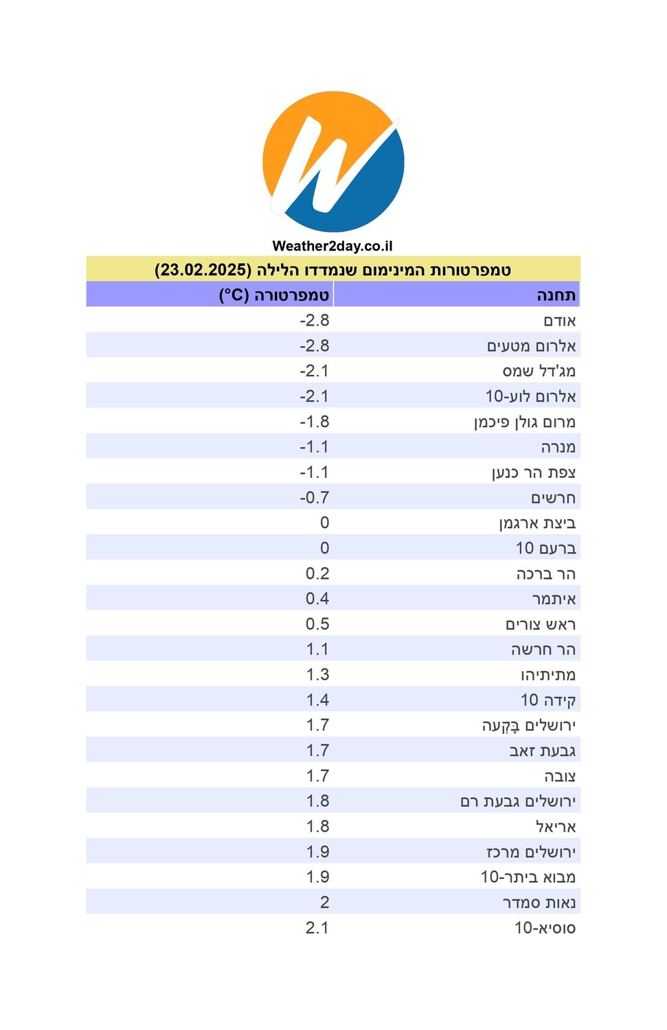 - טמפרטורות המינימום שנמדדו הלילה (23.02.2025) Weather2day