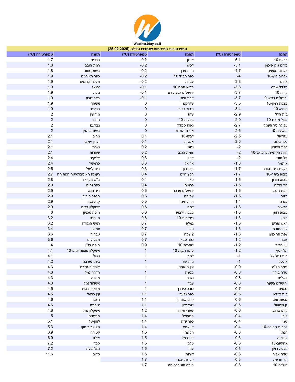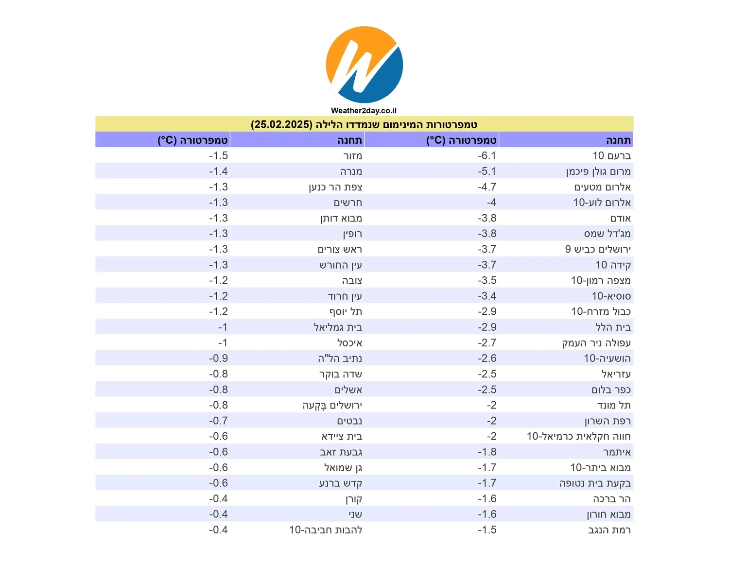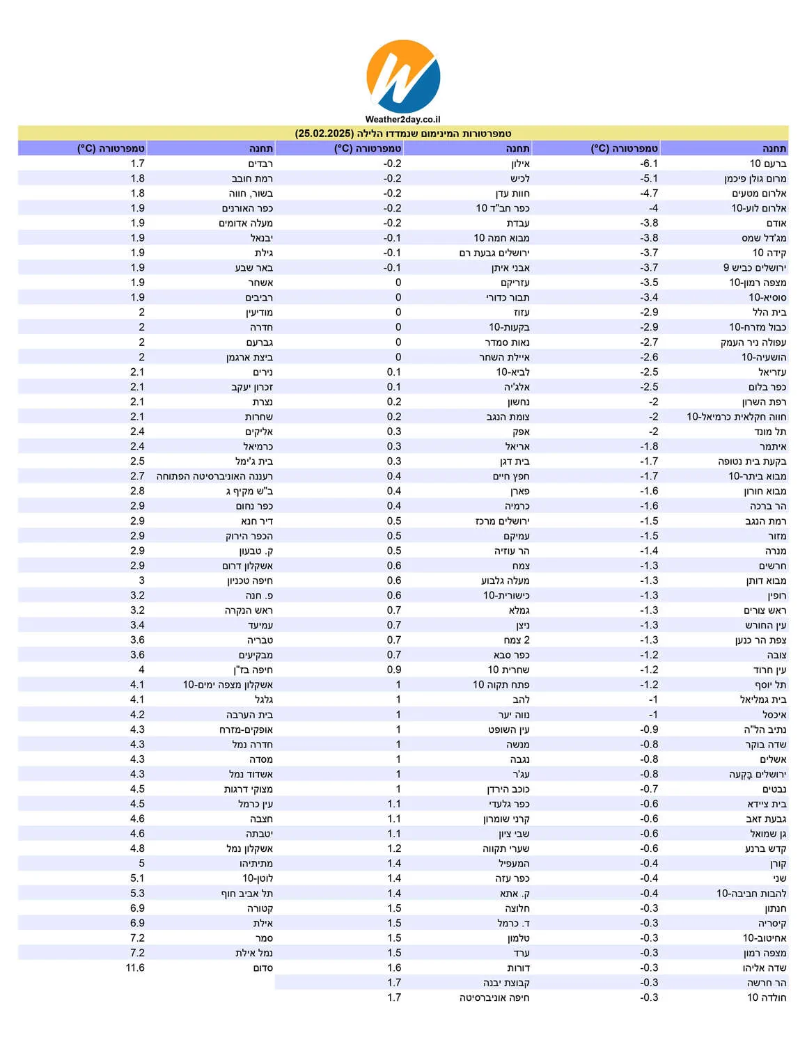 - טמפרטורות המינימום שנמדדו הלילה (יום שלישי, 25.02.2025) Weather2day