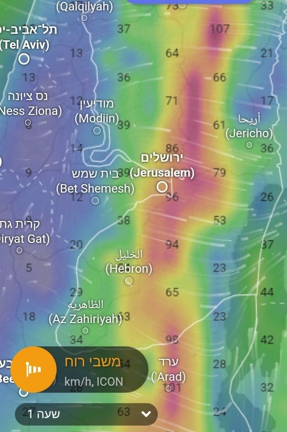 פס של רוח מהירה באזור מעבר ההרים ורוחות חלשות ממזרח וממערב