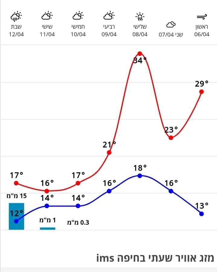 יום ראשון ( 06.04.25 ) : בבוקר בהיר וקר בעיקר בהרים ובאזורים הפנימיים, משעות לפני הצהריים יעשה מעונן חלקית בעננות גבוהה ובינונית שיכולה לטפטף משעות אחה"צ, משעות אחה"צ יתכן אובך, במשך היום התחממות ניכרת של בין 7-12 מ"צ והלחות תרד, יעשה חם מהרגיל ויבש עד שרבי ברוב אזורי הארץ. הרוח מזרחית מתונה עד ערה שתורגש בעיקר בהרים ובצפון הארץ, במישור החוף הרוח מזרחית בבוקר ומשעות הצהריים תחוג לצפון צפון מערבית.