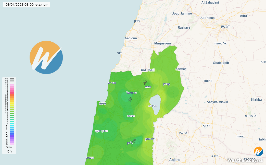 - השוואה בין הטמפרטורות בצפון היום ב-09:00 לאתמול באותה שעה Weather2day