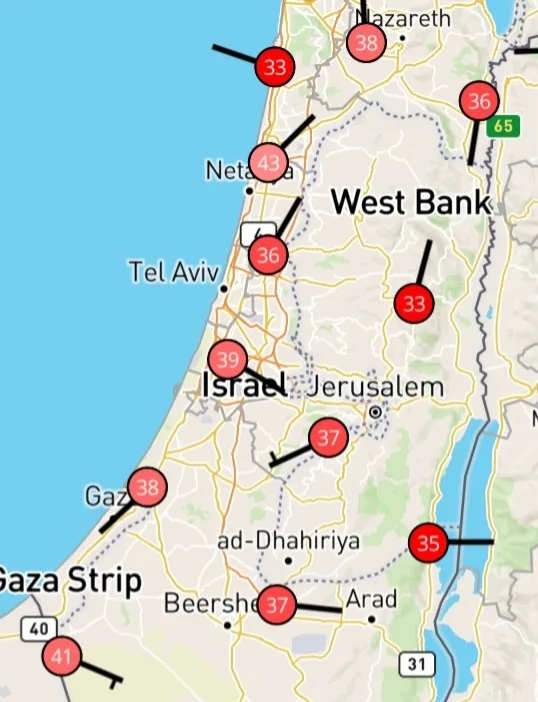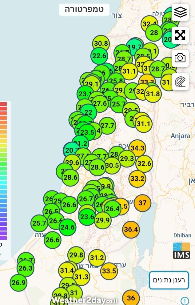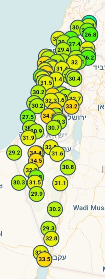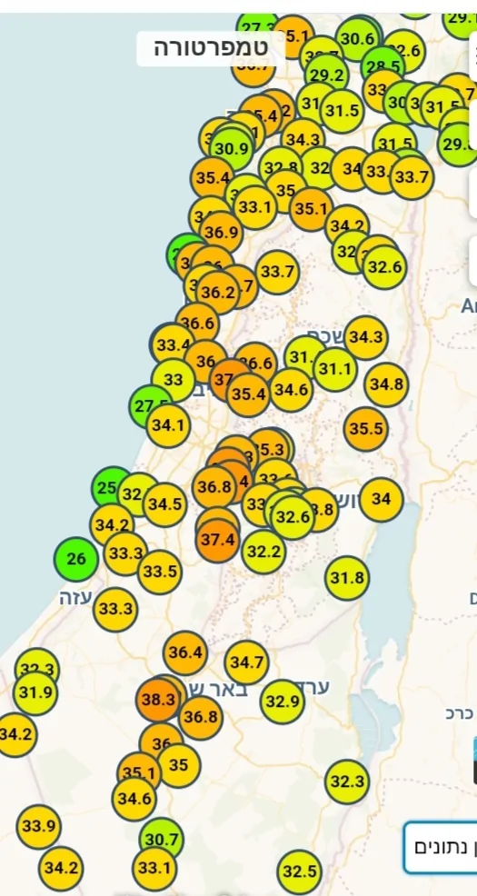 משיא של 38 מעלות בשעה 14:00 ל-31.8 מעלות כרגע וממשיך לרדת