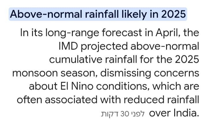 המונסון שמתחיל בדרך כלל ב-1/6, יקדים השנה בכמה ימים. ובינתיים 100 ממ בבנגלור בגשמי טרום מונסון