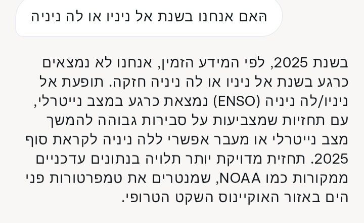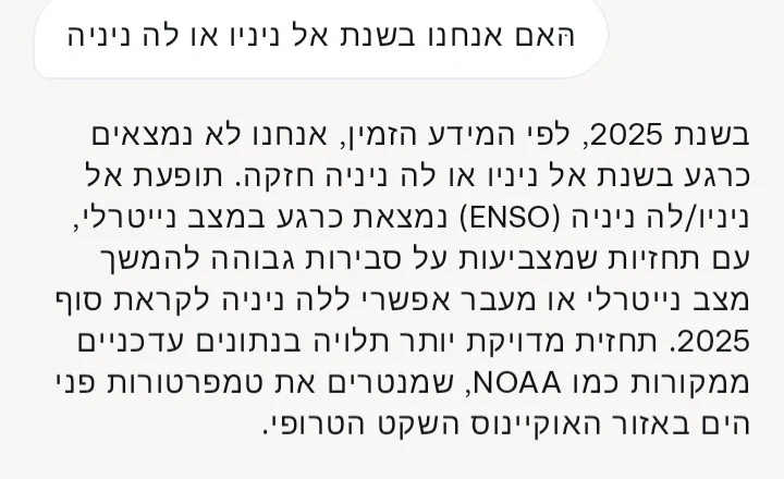 כרגע ניטרלי, וכמעט 50-50 בין ניטרלי ללה ניניה עונה הבאה. הסיכוי לאל ניניו נמוך ועומד על כ15%. אם אנחנו צמודים בין ניטרלי ללה ניניה אז רוב הסיכויים שגם אם תהיה לה ניניה היא תהיה חלשה.