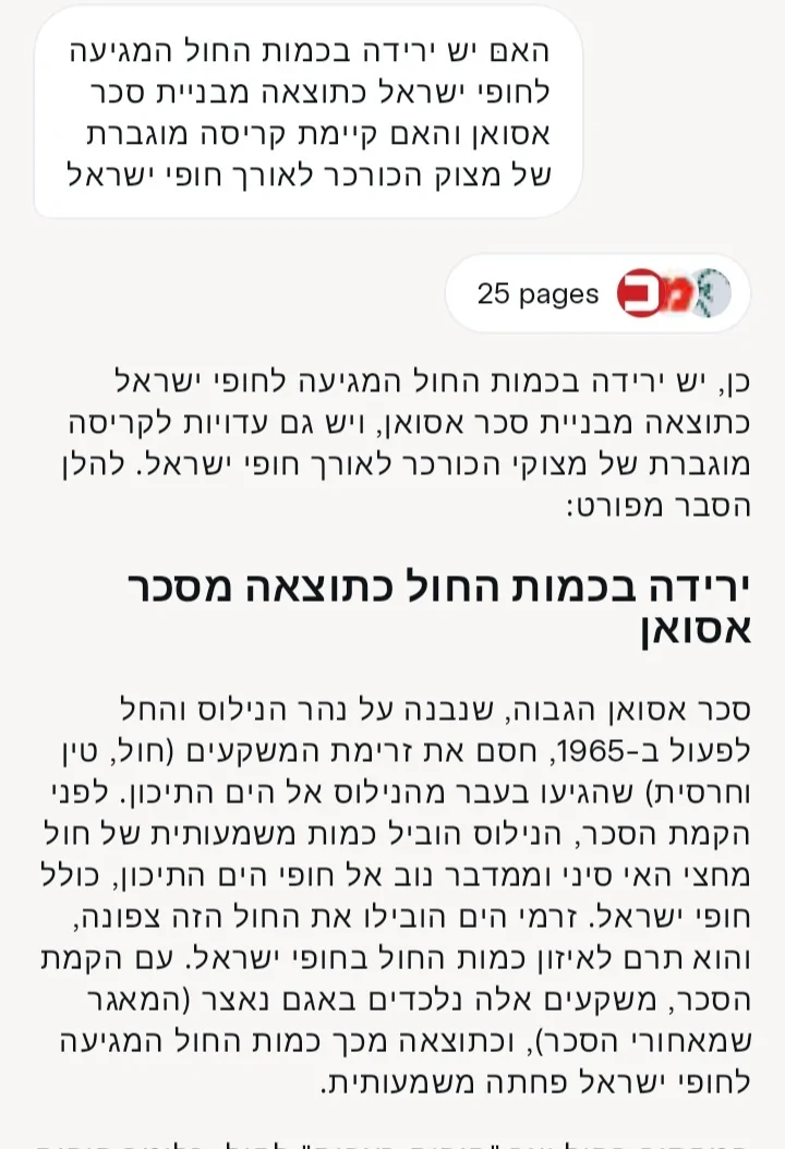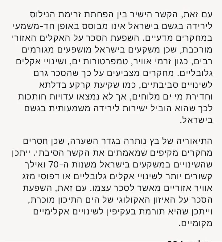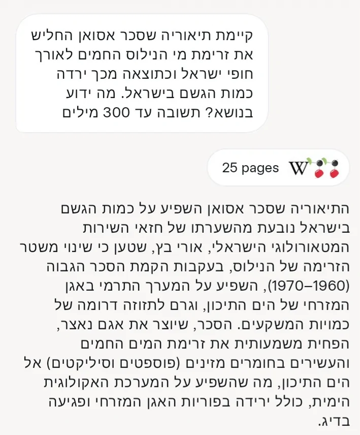 לפני הרבה שנים פגשתי אותו והוא אמר לי משהו שלא חשבתי עליו: לפני סכר אסואן מי הנילוס המתוקים והקלים המשיכו לזרום לאורך החוף עד לבנון. היו לכך שני אפקטים ראשיים:1) הזרמת חול לאורך חופי ישראל עם כמויות הולכות ופוחתות ככל שמצפינים. 2) מי הנילוס החמים יחסית יצרו התאדות מוגברת ועזרו להגדיל את כמות הגשם בארץ, במיוחד לאורך החוף.