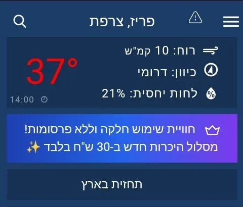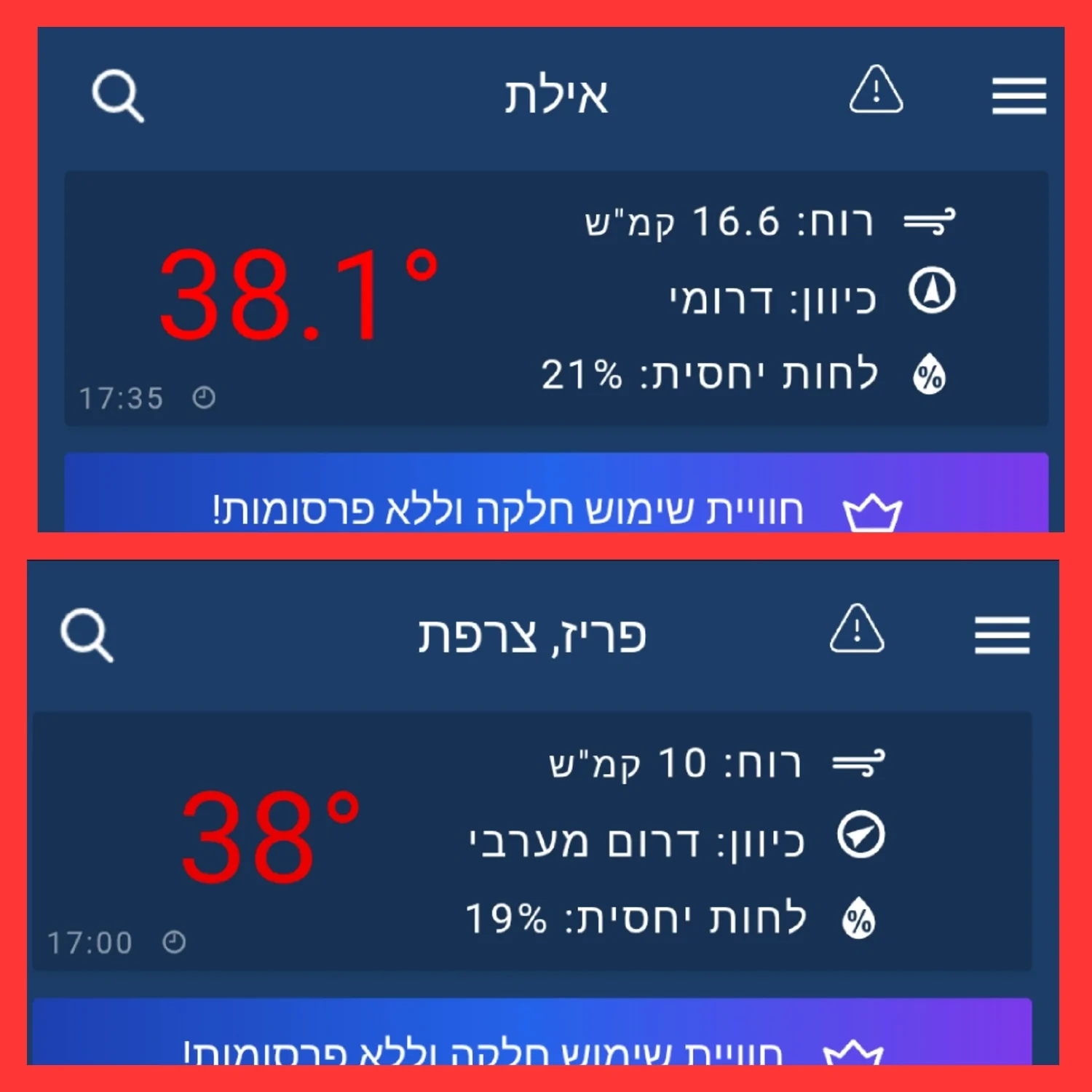 שיש 38 מעלות בפריז זה לא כמו 38 מעלות בירושלים או בחריש זה כמו 45 מעלות בלי להגזים