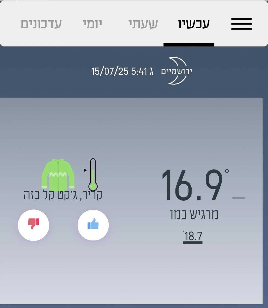 - כעת: 14.5° בברעם, 14.9° בסוסיא, 16.0° בשכונת בקעה בירושלים מתנאל
