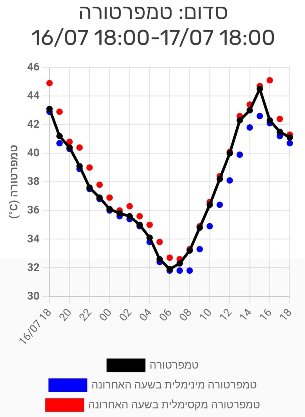- בתחנת סדום הטמפ' הגיעה עד 45.1°, הטמפ' הרשמית הגבוהה ביותר בארץ היום אבי (חריש)