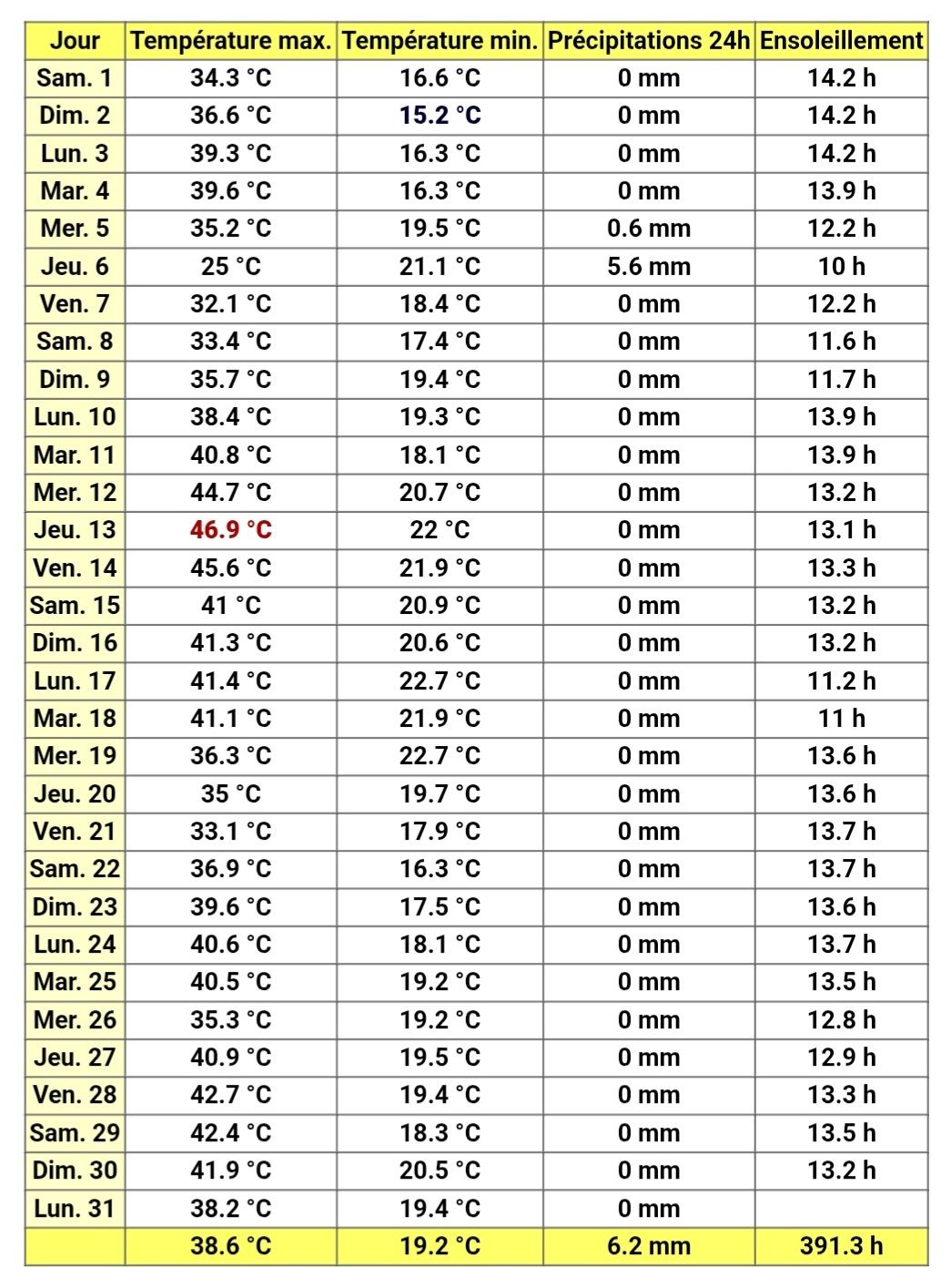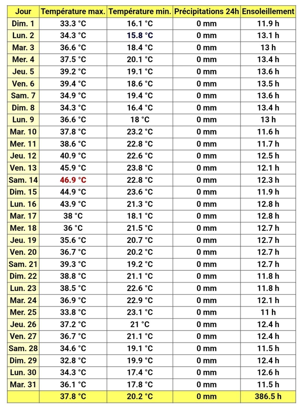 בשני החודשים הללו הטמפ' הגיעה עד 46.9° - הטמפרטורה הרשמית הגבוהה ביותר שנמדדה בעיר.