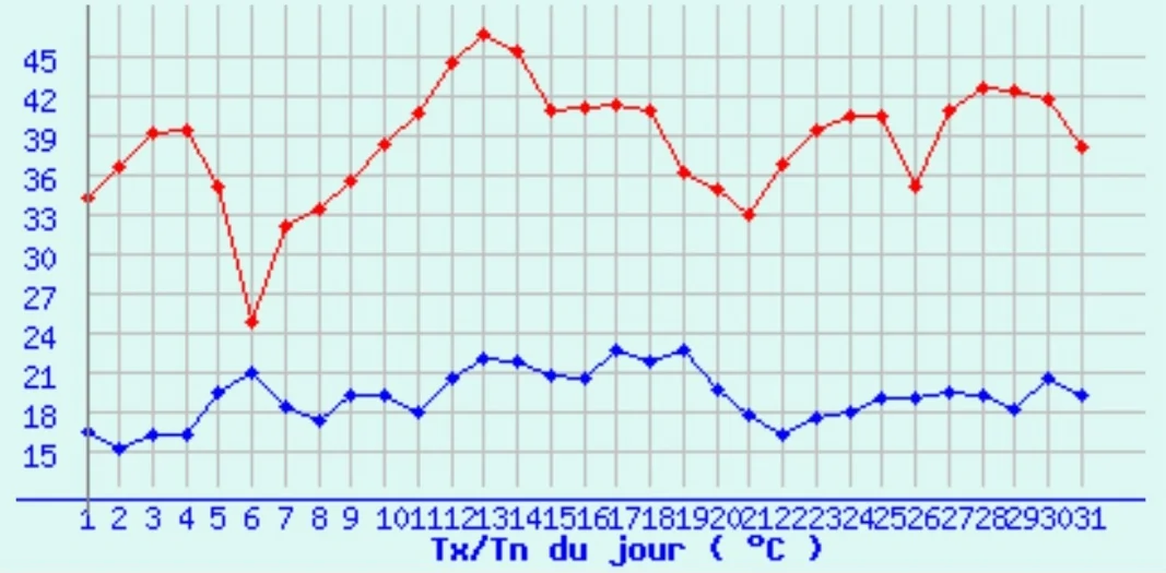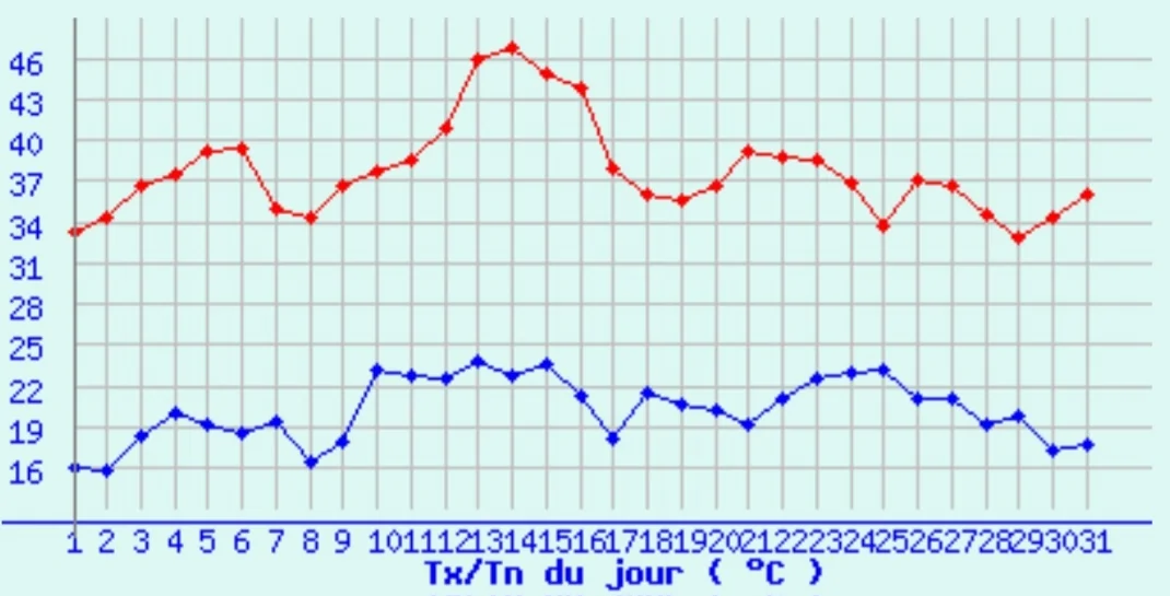 בשני החודשים הללו הטמפ' הגיעה עד 46.9° - הטמפרטורה הרשמית הגבוהה ביותר שנמדדה בעיר.