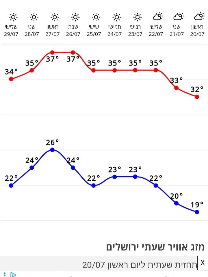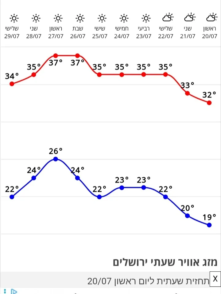 יום רביעי ( 23.07.25 ) : בהיר, הטמפ' ללא שינוי ניכר ועדיין חם מהרגיל לעונה עד שרבי, עם עומסי חום כבדים עד קיצוניים. הרוח צפון מערבית קלה.
