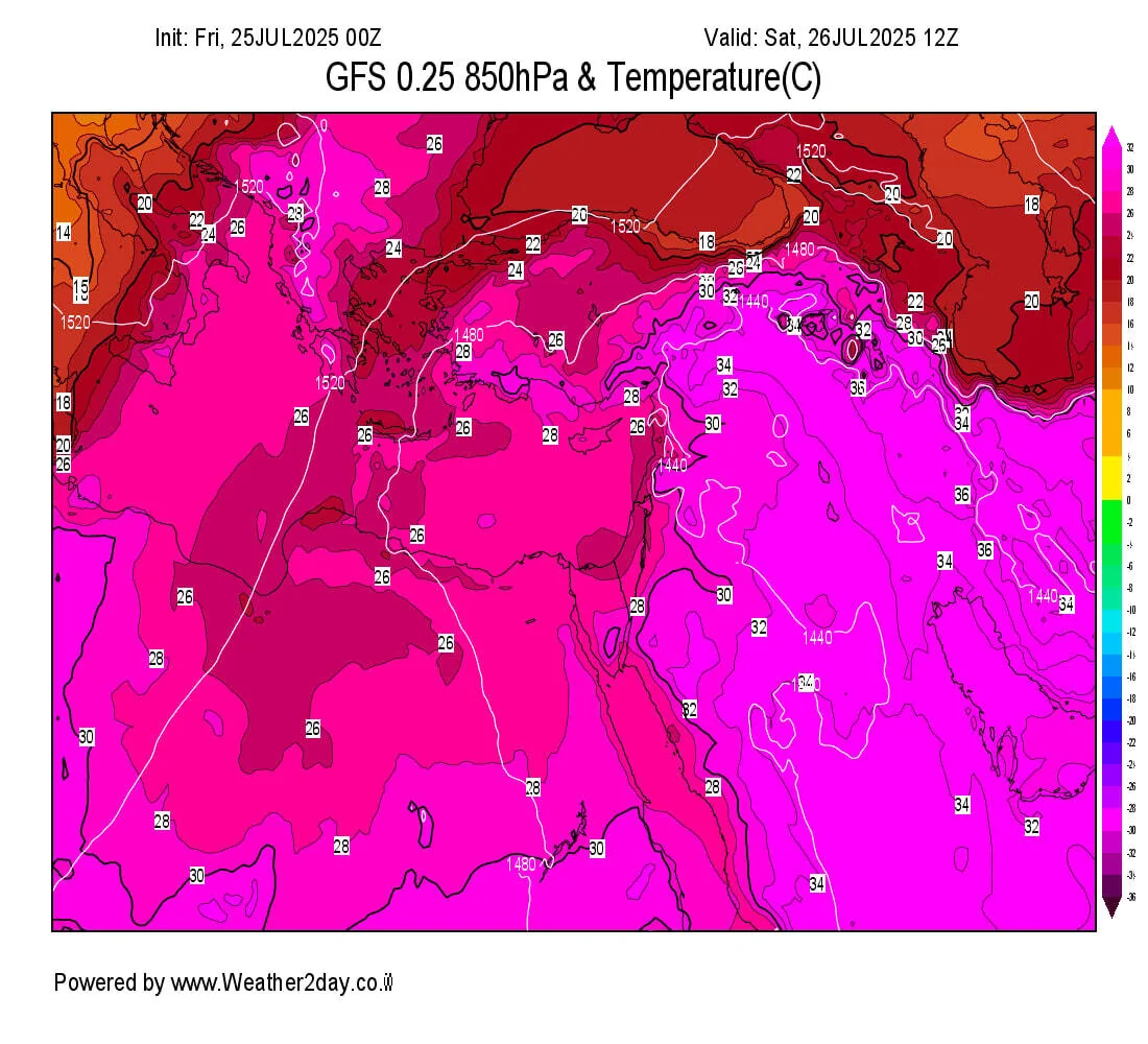 טמפרטורת האוויר בגובה של 850 מיליבר באזורנו סביב 28–30°C כך שטמפרטורות הקרקע ינועו סביב 38–42°C ונקודות מעל 45°C במזרח הארץ.