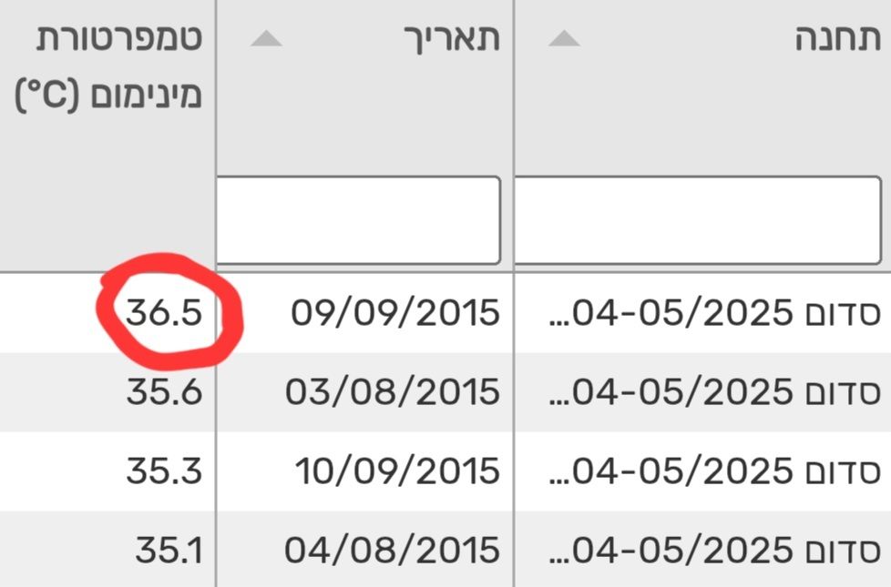 אגב כששאלתי את גוגל אז הוא הפנה אותי לויקיפדיה של סדום וכתוב שם שנמדד מינימום של 37 מעלות בתחילת אוגוסט 2015, כנראה נפלה טעות שם והכוונה לאותו האירוע של ספטמבר והמעלות עוגלו ל-37°. בתחילת אוגוסט של אותה שנה נמדדו מינימום גבוה של 35.6°, הלילות הלוהטים שקרו באוגוסט ובספטמבר (אפשר גם לראות בצילום המסך שצירפתי בתגובה הקודמת) מראים עד כמה 2015 היתה חריגה.