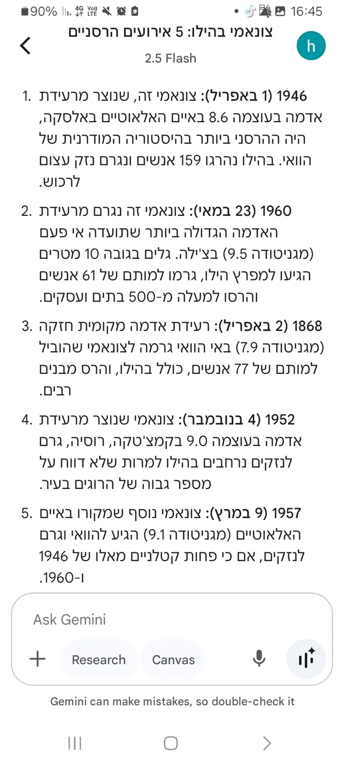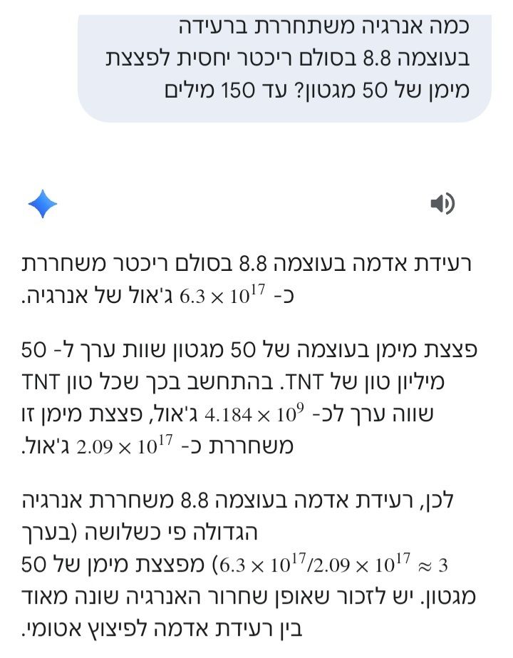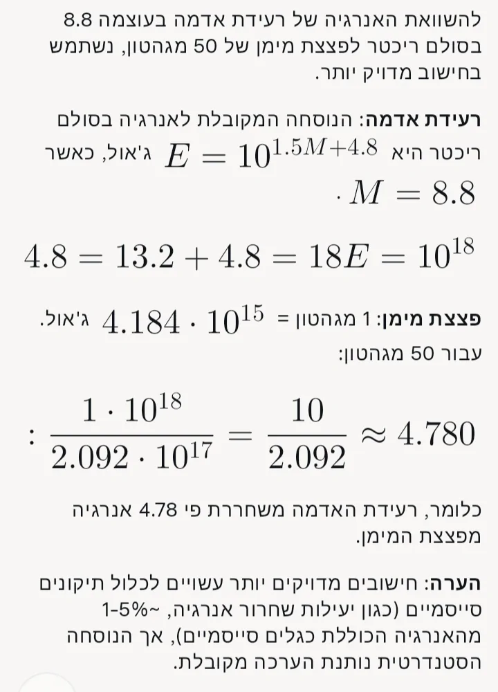ביקשתי מ-AI להשוות את כמות האנרגיה המשתחררת ברעידה בעוצמה 8.8 יחסית לפצצת המימן הגדולה ביותר, כ-50 מגטון.