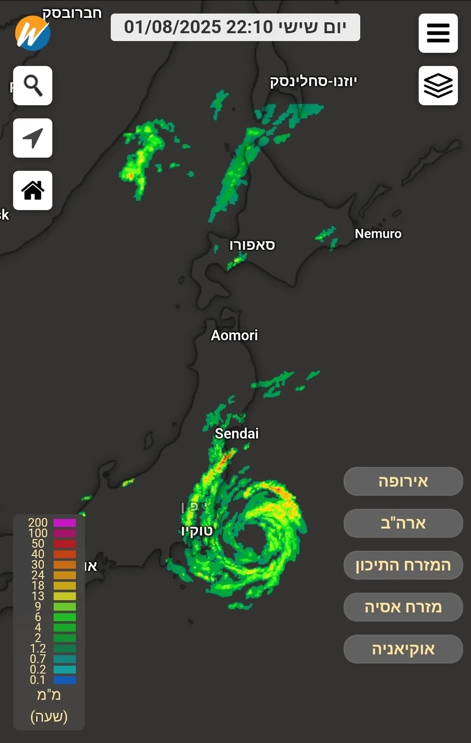 - וכך זה נראה במכ"ם הגשם העולמי באפליקציה כאן: אבי (חריש)