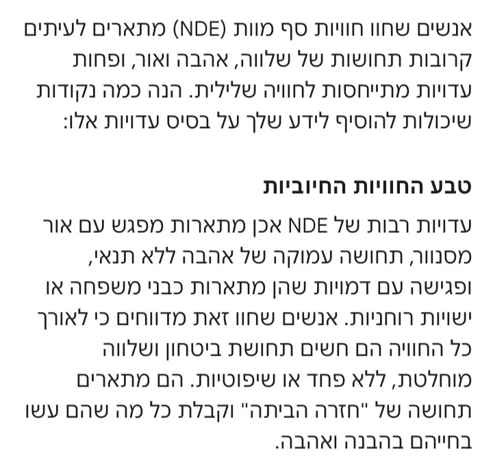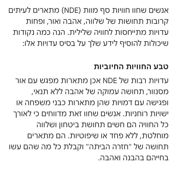 מיליוני אנשים מתו מוות קליני והוחזרו לחיים ע"י מכת חשמל/ דפיברילטור או בשיטות אחרות. קיימות המון עדויות של אותם אנשים לגבי העולם הבא. כמעט כל העדויות חיוביות ומעט מאוד שליליות. הנה סיכום קצר של AI בנושא