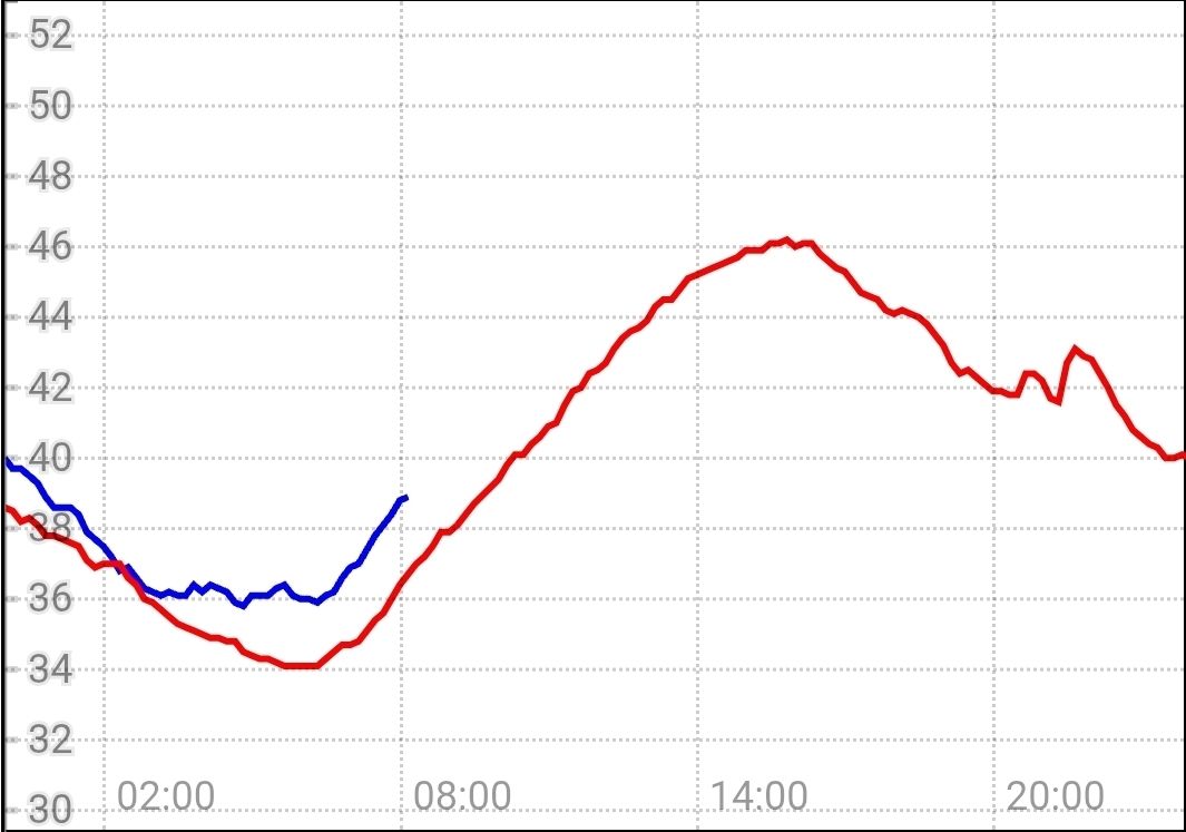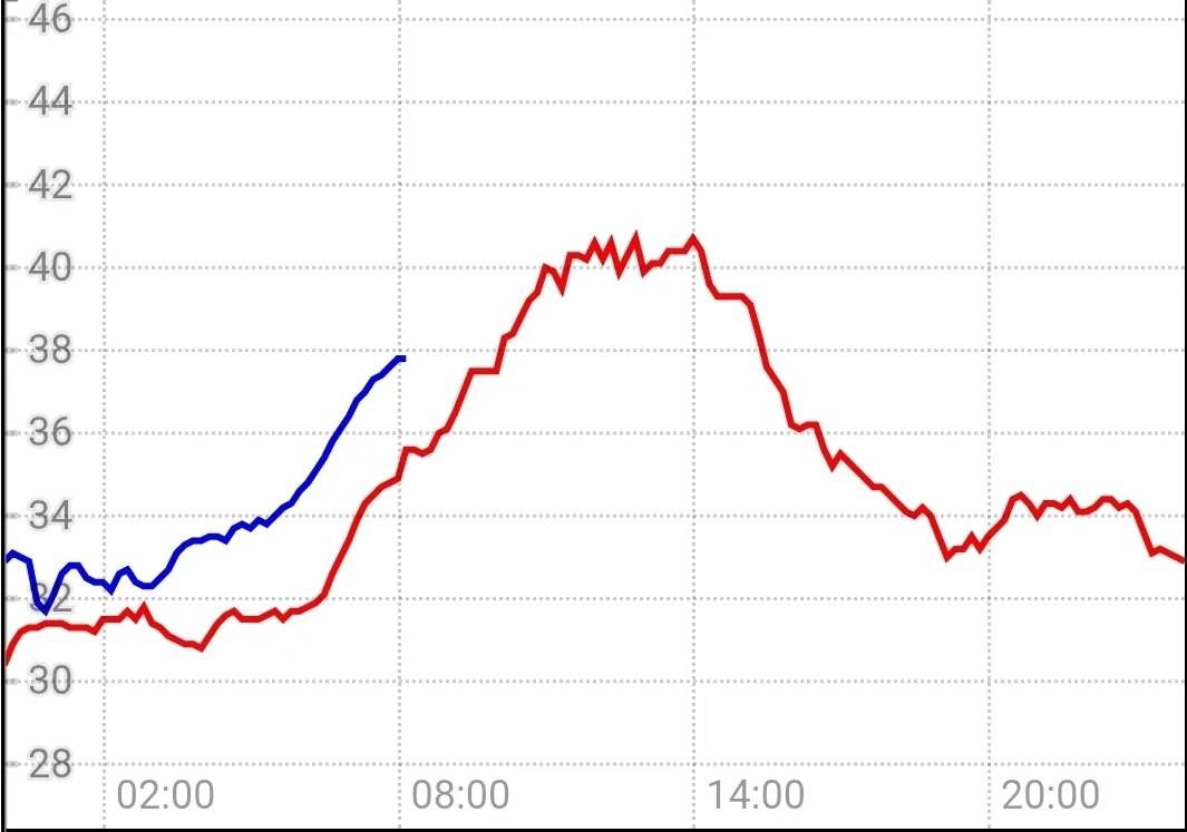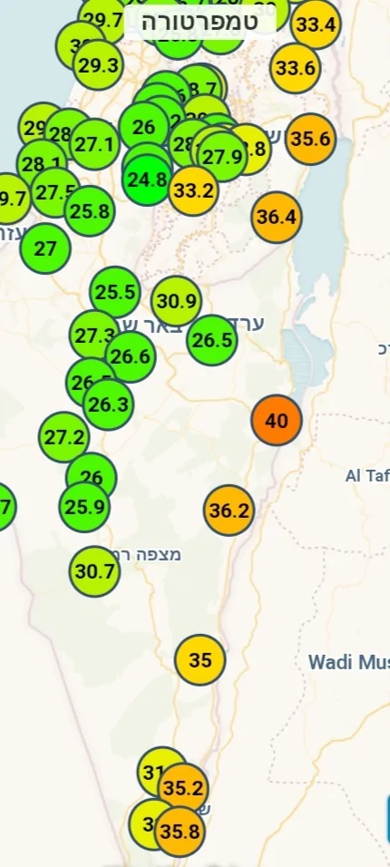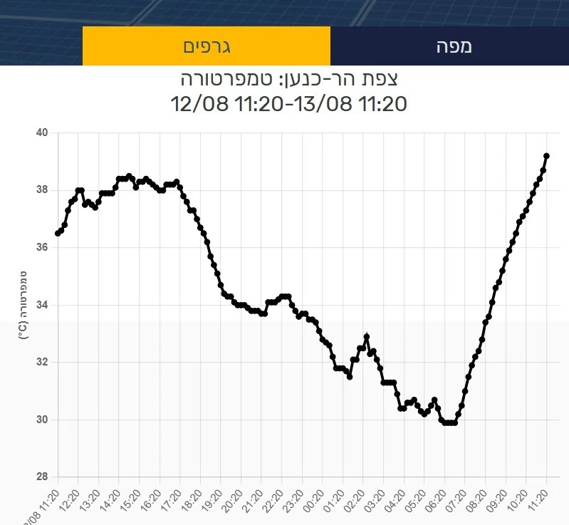 - כנראה יישבר שיא. בלילה הקודם בשעה זו היו 37.7°. כעת 39.3° מתנאל