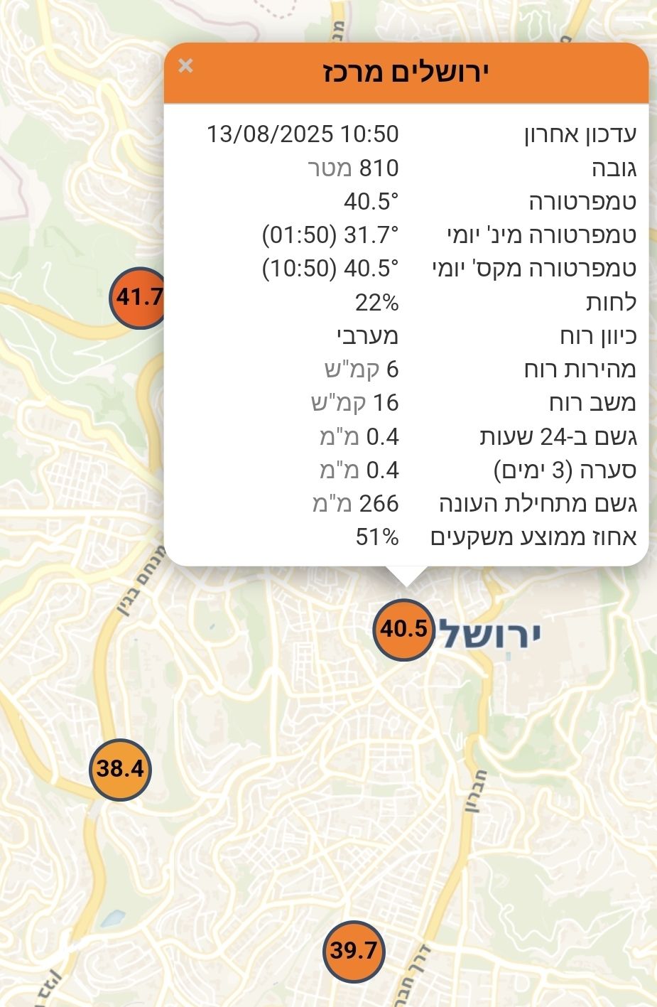 40.4 מעלות נמדדות עכשיו בירושלים ???? נראה שנשבור שם בשעות הקרובות את השיאים הקודמים של אוגוסט 2023 וייתכן שגם את של ספטמבר 2020 ????️