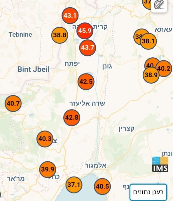כרגע 45.3 מעלות והשיא עומד על 47 מעלות מספטמבר 2020. יש עוד שעתיים לשיא היומי בערך, ואנחנו 3 מעלות מעל אתמול.