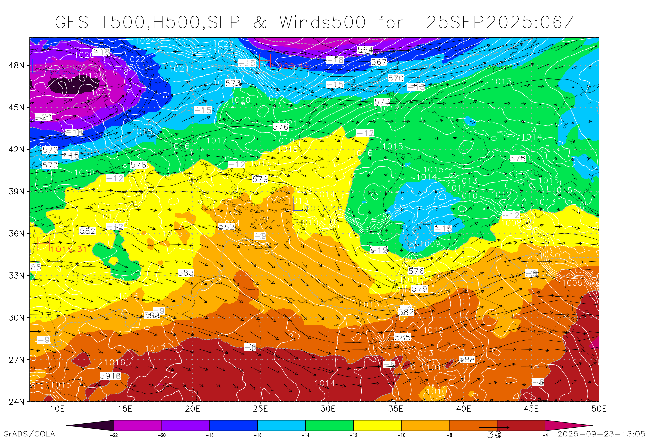 - מפת לחץ בפני הקרקע+גובה,טמפ', רוח 500 מ"ב ע"פ מודל GFS. קוזוקרו אבי