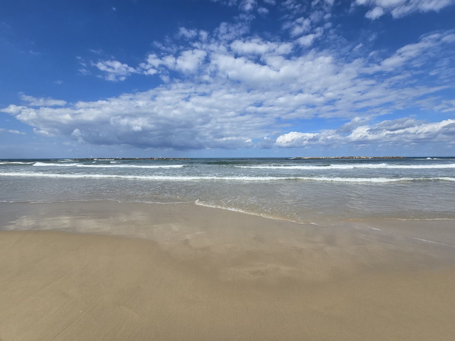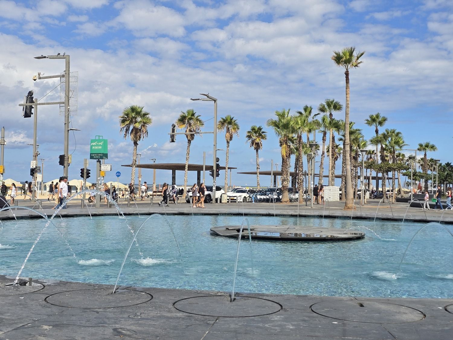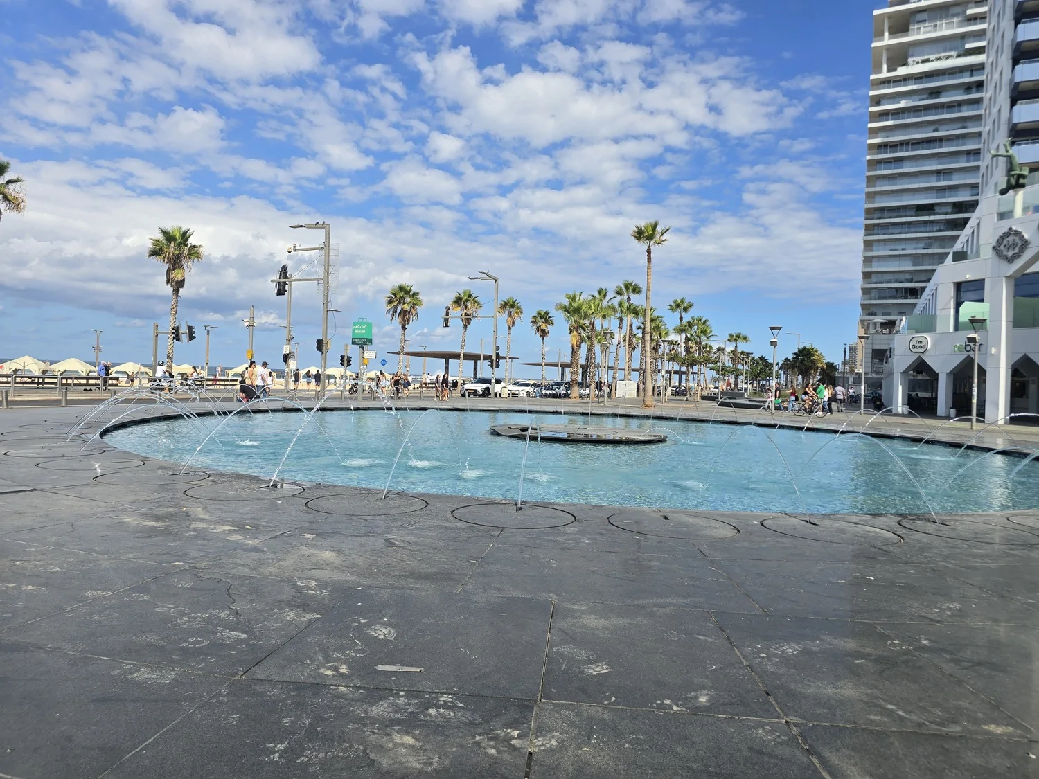 ים גלי, עננות יפייפיה, ומזרקות ודקלים.