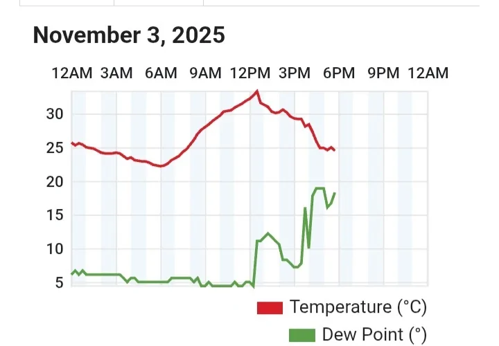 - לחות לא אופיינית לנובמבר הייתה היום - 27-28 מ"צ עם 70%-75% לחות דרור
