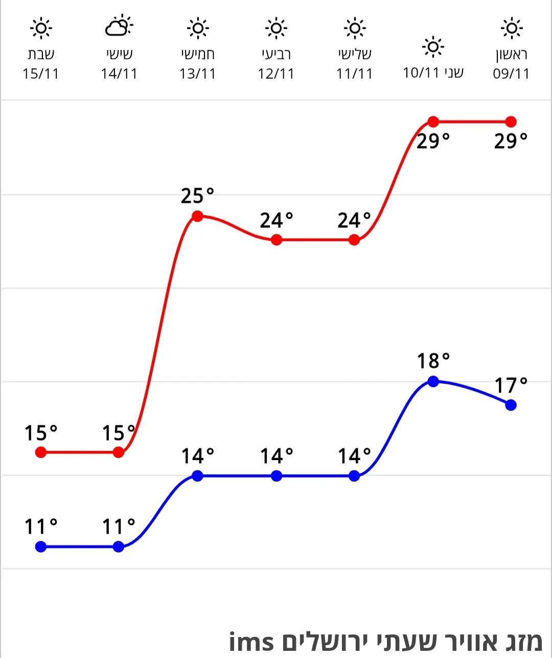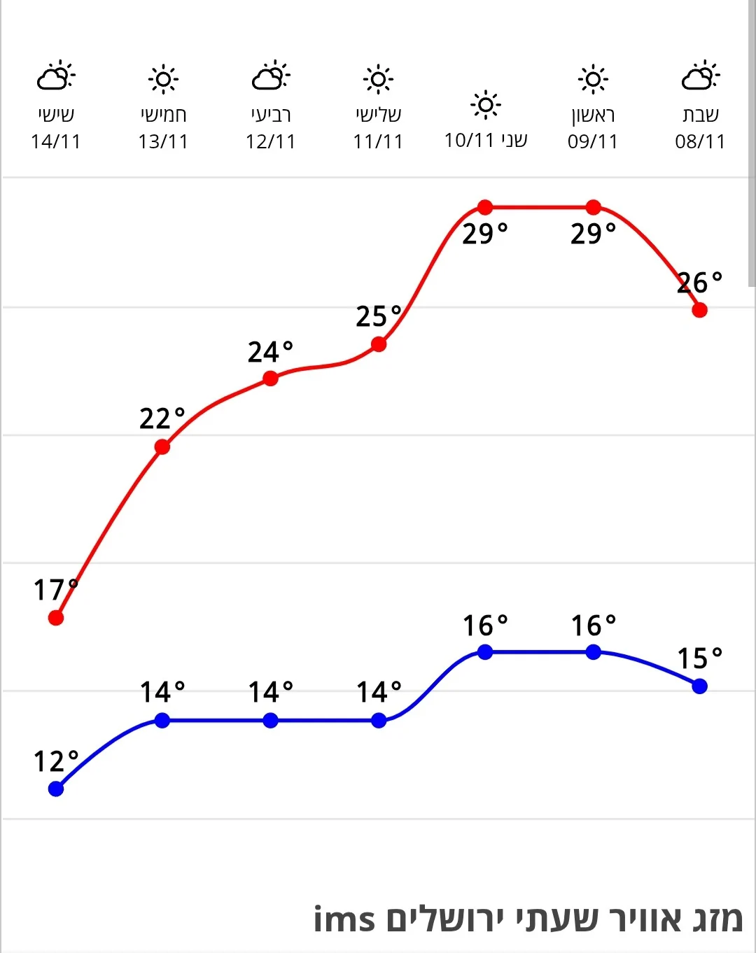 - ירושלים: תחילת השבוע עם 29 מעלות. סופ"ש עם 17 מקס' מתנאל