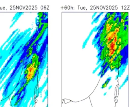 בהמשך, עם כניסת לחות גם לשכבות הנמוכות יותר (900-800 מ״ב), יעלה משמעותית הסיכוי לממטרים חזקים יותר במהלך ליל שלישי.