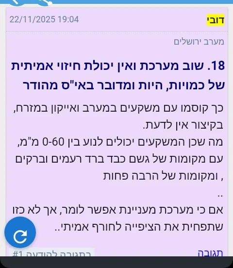 מקום אחד מקבל 100 ממ.. 15 קמ משם מודדים רק 30 ממ כהקבלה למערכות פסיכיות שנופלות משומקום ואחרות שמגיעו. דרדלה או כלום ושום דבר.... נקווה לסיים כבר תקופה סו ולעבור למערכת יציבה יותר... הלי חם/קר/חם/גשם/חם......