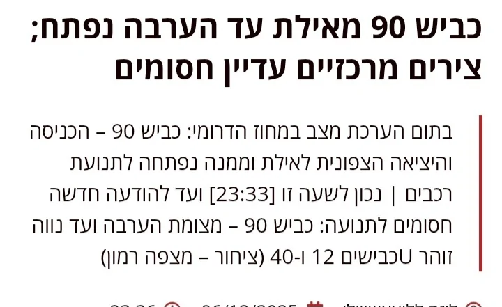 - הכבישים לאילת חסומים. כביש 90 לצפון פתוח חנוך א