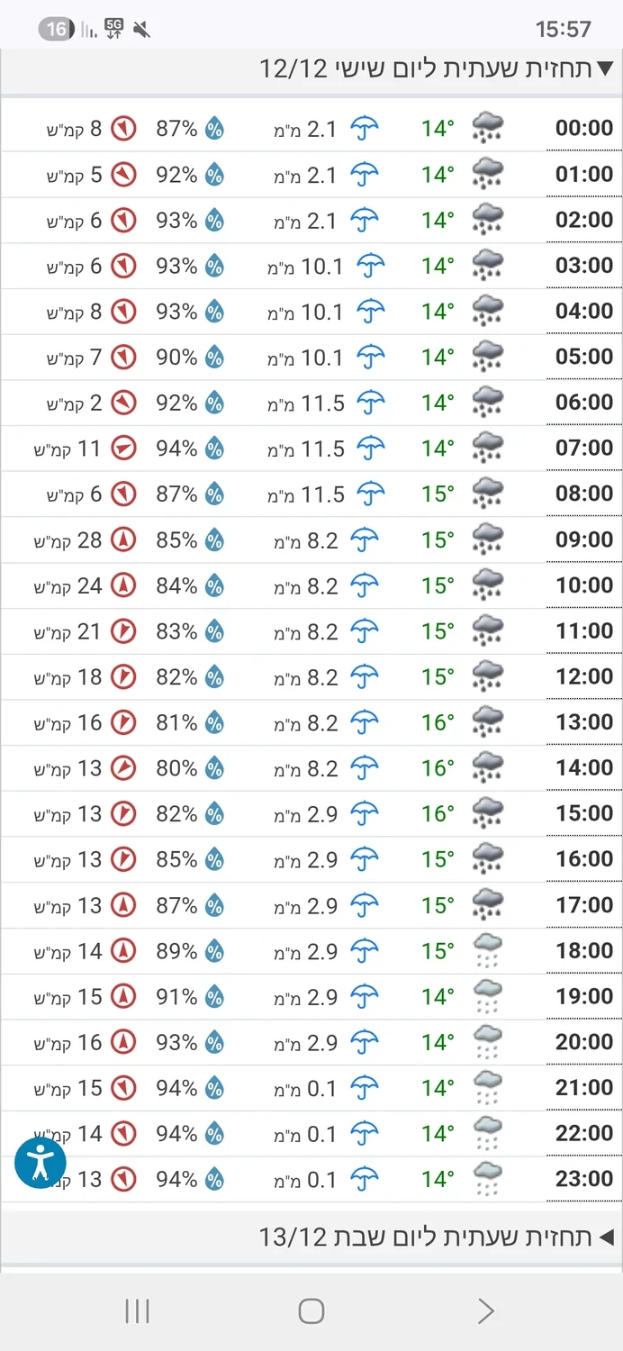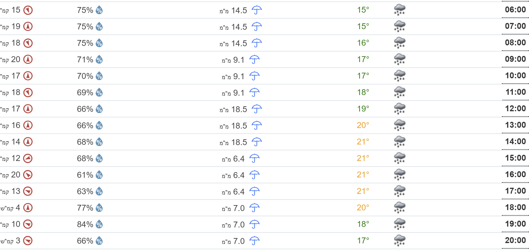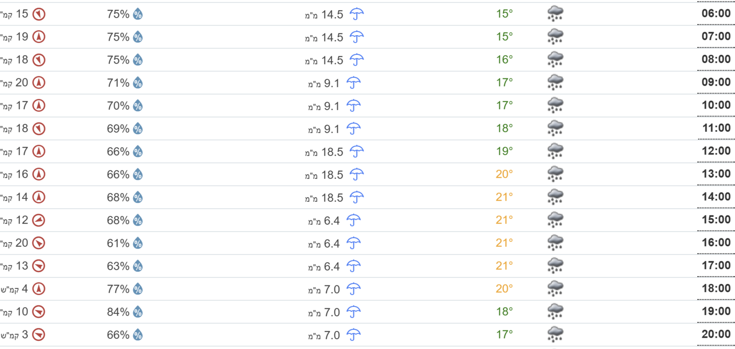 היום פורסמה גרסה חדשה, שלכאורה מציגה תחזית שעתית לכל אחת מ־24 השעות במועדים הרחוקים יותר. בעקבות זאת הופיע מצב מוזר: נראית בדיוק אותה כמות משקעים בכל שעה, ובימים מסוימים הכמות אף מוכפלת פי שלושה או מופיעה זהה במשך שש שעות רצופות.