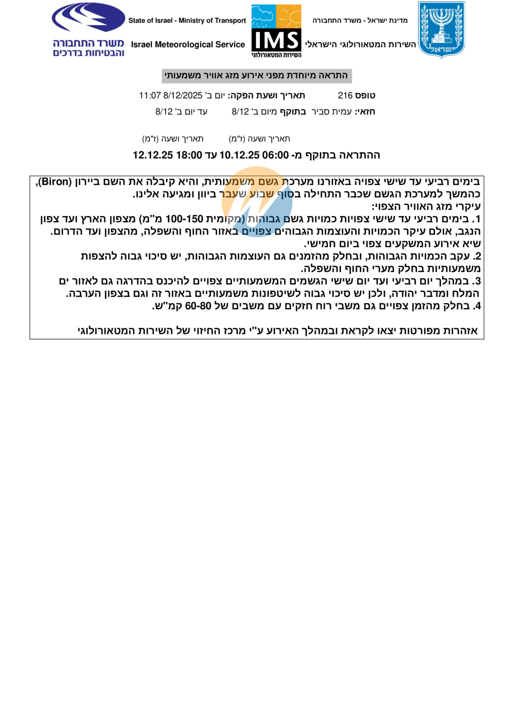 השירות המטאורולוגי: התראה מיוחדת - הסופה ביירון