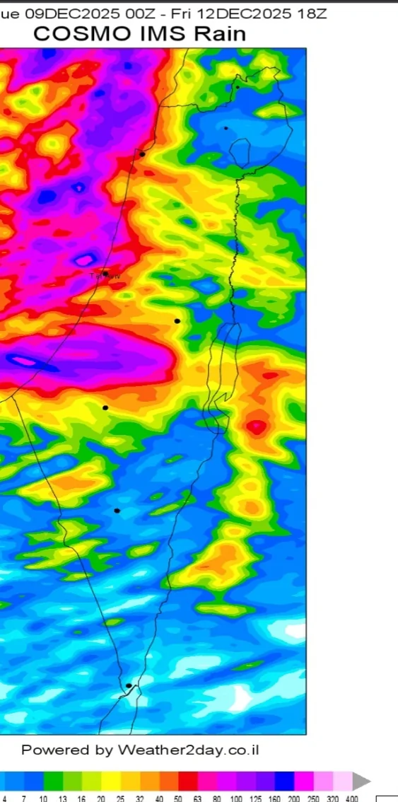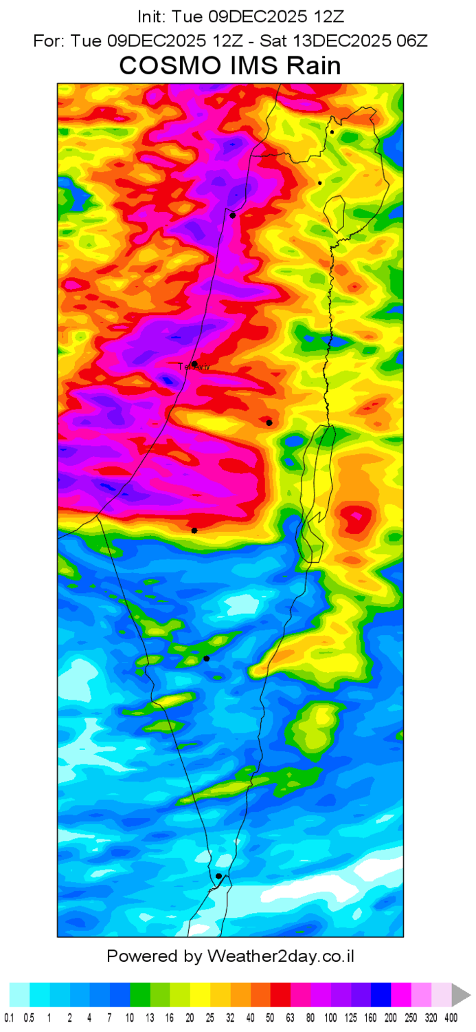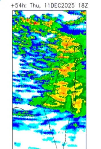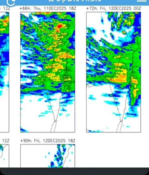 בשעות השיא , בחמישי, העסק שם יהיה יותר סוער וגשום, עם פרקי גשם עוצמתיים מאוד, ועם חששות חמורים להצפות ושטפונות. המסדרון הוא ככל הנראה בין אשדוד-אשקלון- העוטף למזרח הארץ פנימה.