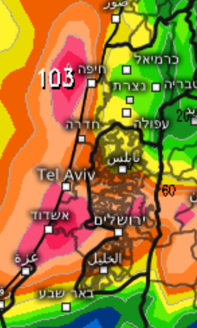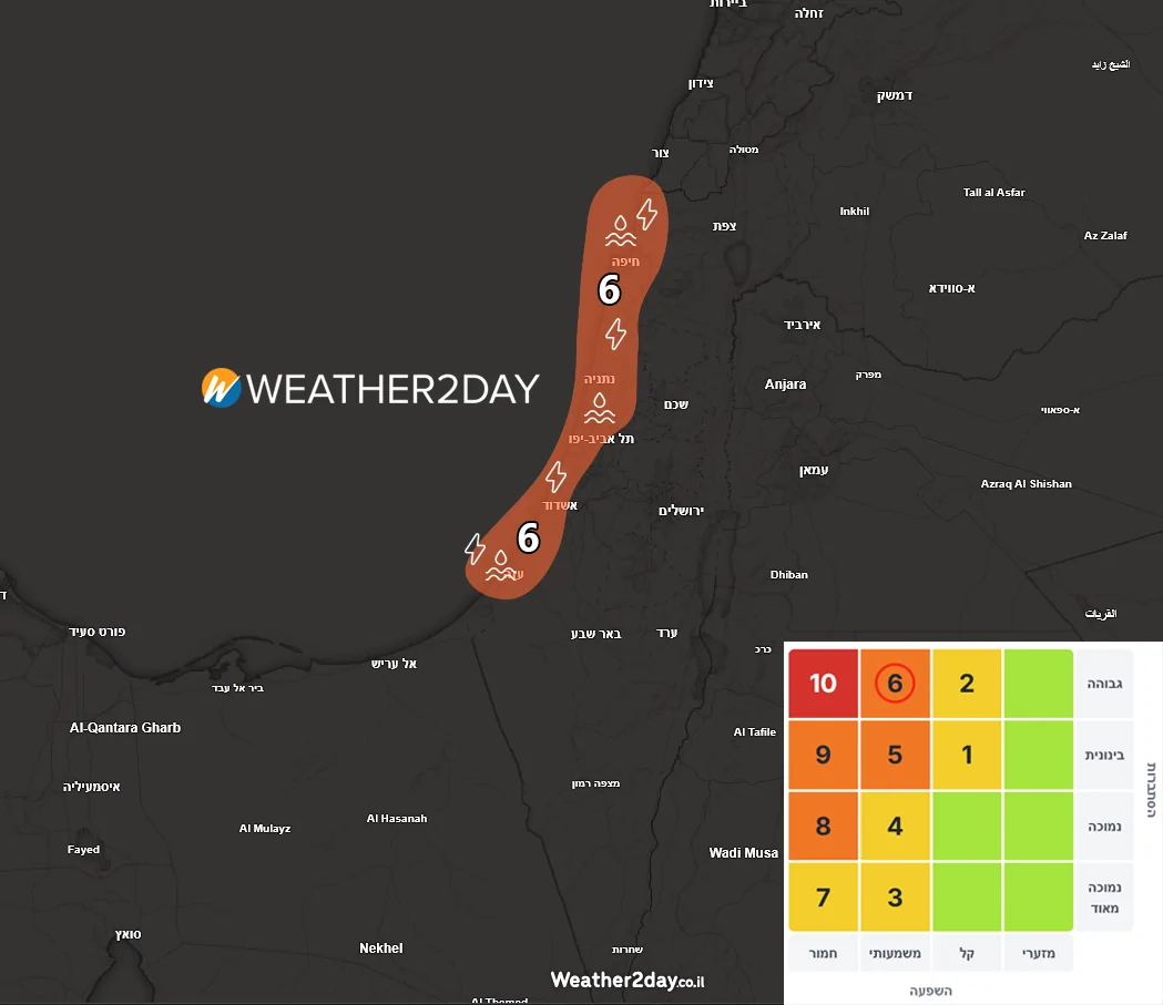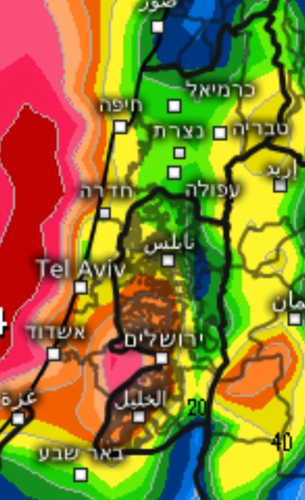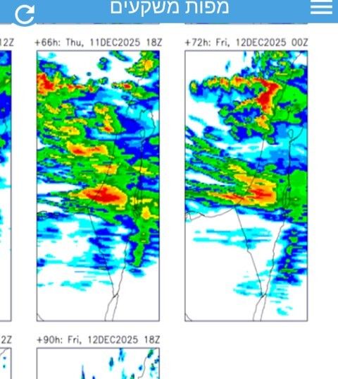 אך יש אינדיקציה שעיקר האקשן בשעת השיא, כנראה בחמישי יהיה דווקא בפנים, בשפלה ואפילו יותר פנימה בהרים. לפי זה החשש והאירועים המשמעותיים יכולים לקרות דווקא כהצפות שפלה פנימית ושטפונות.