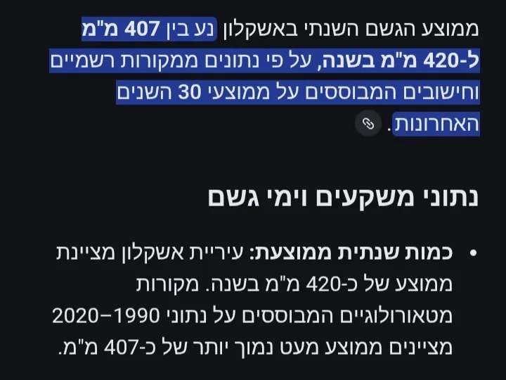 הממוצע העונתי באשקלון לפי השמ"ט הוא 380 מ"מ.