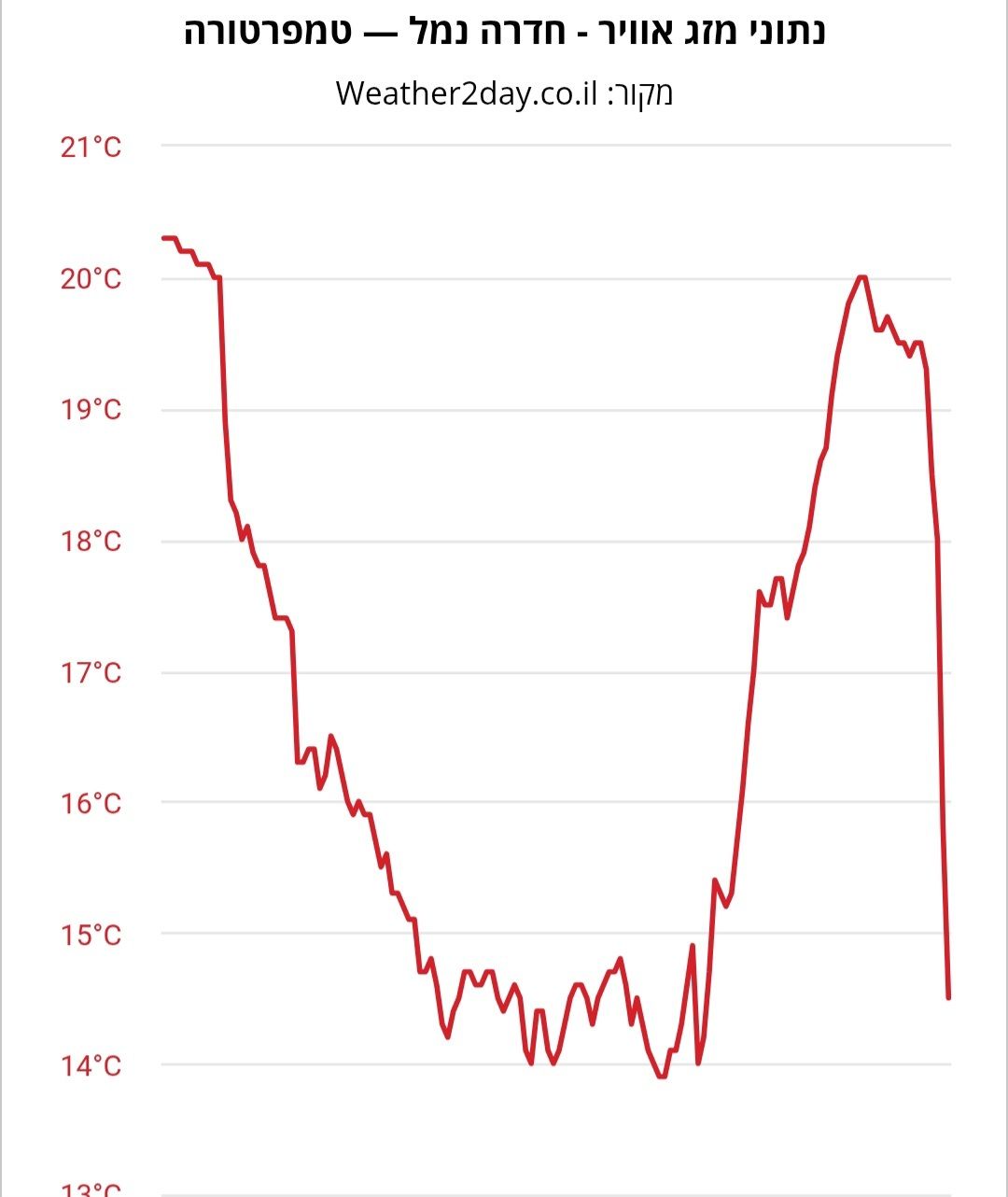 - עם הגעת הגשם לשם, ירידה חדה תוך שעה מ-19.5° ל-14.5°: מתנאל