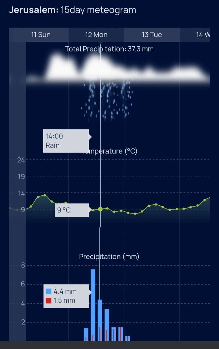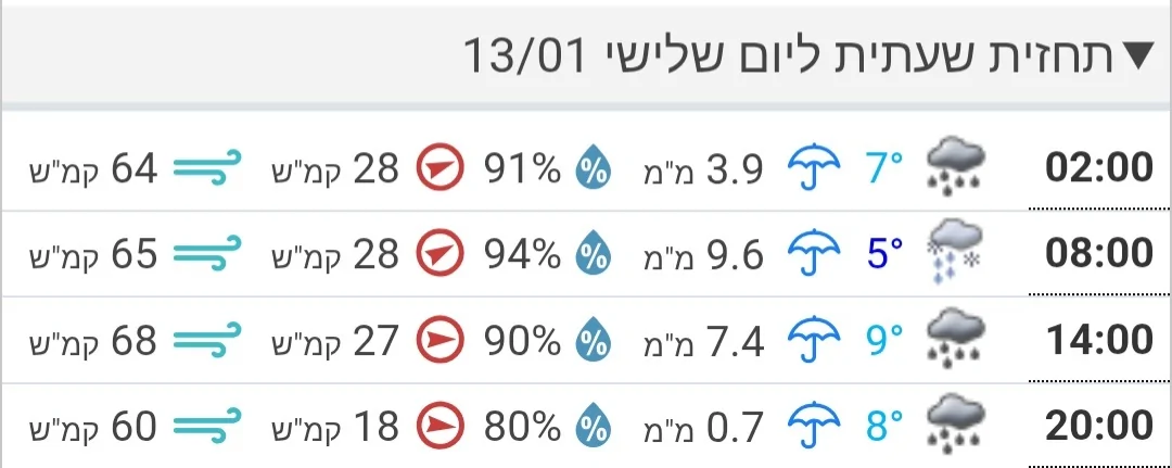 - תחזית האתר ע"פ איסי עם אייקון של גשם מעורב בשלג בירושלים בשלישי הבא: מתנאל