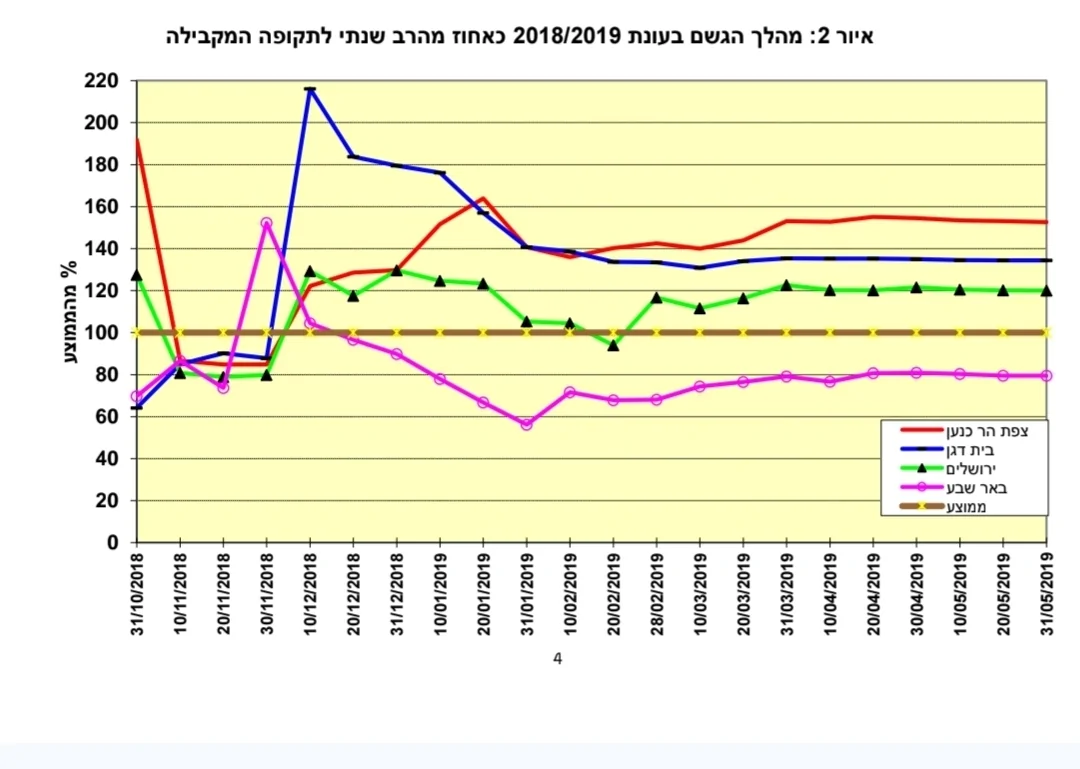לדוגמא, אני מצרף את הגרף המדובר מהסיכום של השמ"ט לעונת 2019. אתה יכול לראות שמאמצע ינואר הסטייה היא לא יותר מ20% מהממוצע לתקופה עד סוף העונה בכל התחנות. ירושלים שרוב העונה היית על 120%, והתחילה בערך זה, סיימה בערך זה. באר שבע שהתחילה ב80% סיימה בערך זה. אם תשווה את ה20 לינואר לסוף העונה אתה תגלה שהסטייה היא מינימלית. אחוזים בודדים בבית דגן, 15% בצפת, וערכים דומים בבאר שבע ובירושלים.