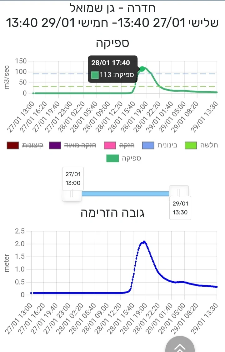 - נחל חדרה זינק אתמול ל-115 קוב/שניה ו- 2 מטר עומק חנוך א
