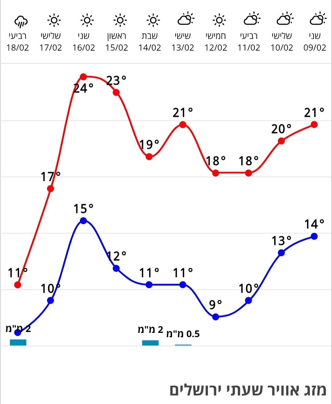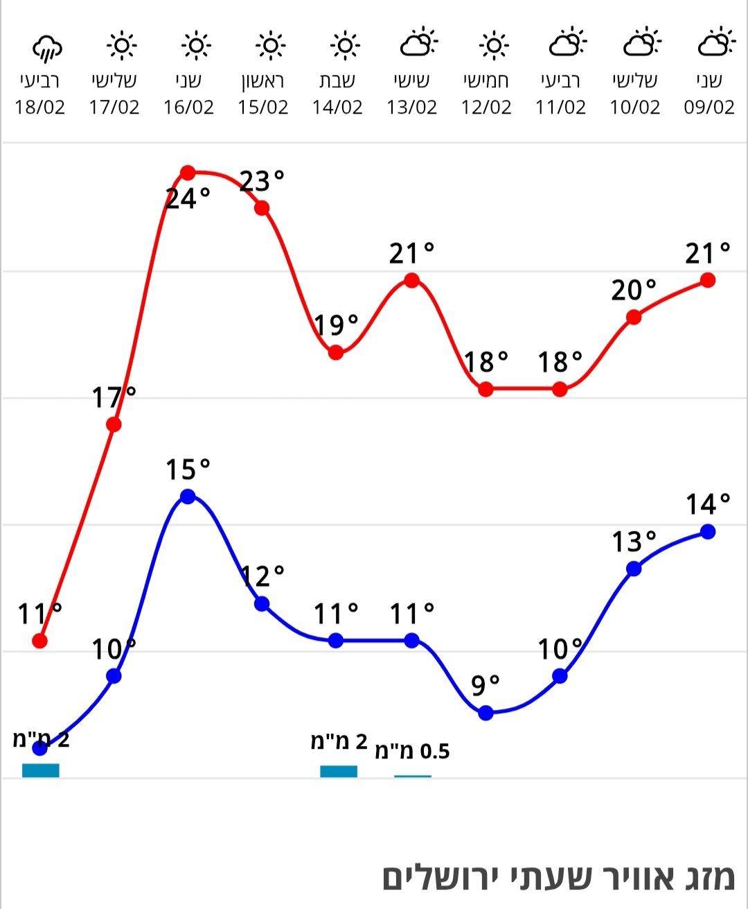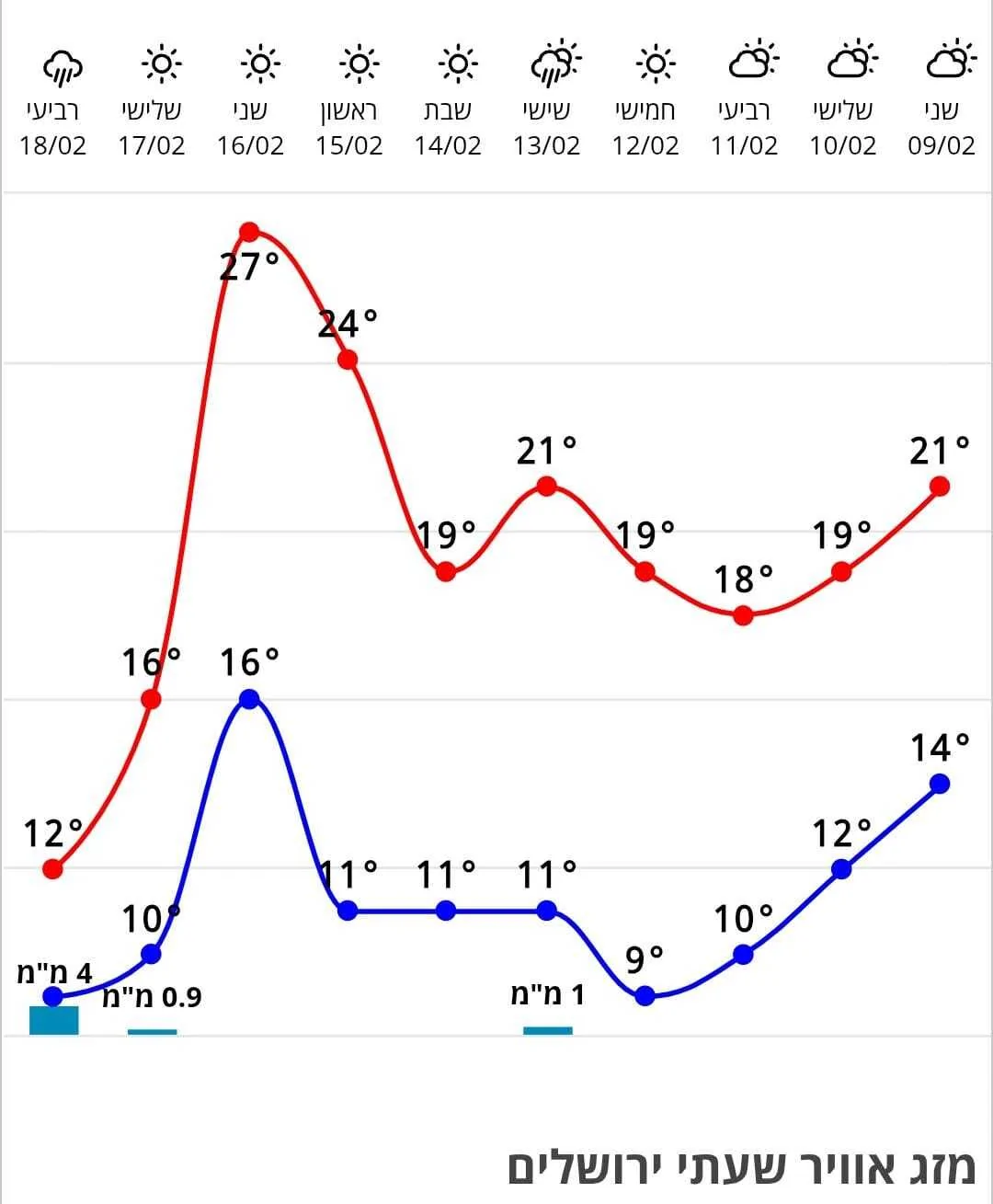 - איסי עם גל חום קיצוני של 27° בירושלים ביום שני הבא ואז צניחה חופשית של 15 מעלות תוך יומיים מתנאל