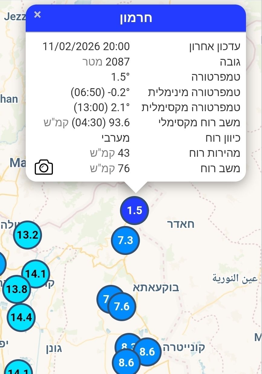 - שלג יורד במפלס העליון בחרמון. הטמפ' 0.9° מתנאל