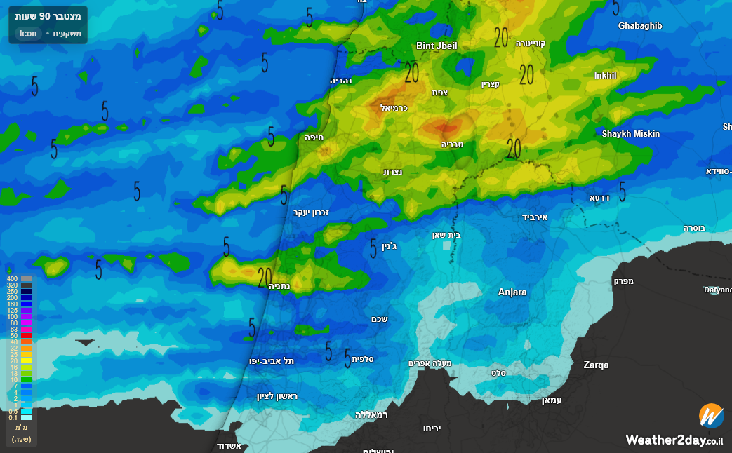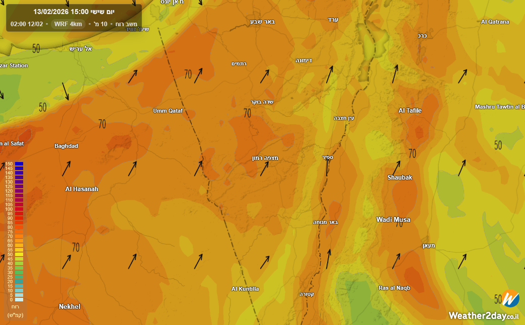 על אילת, שם צפויים גלים לא שגרתיים כלל, הנגב ובמיוחד דרום הנגב והעוטף סביב השעה 18 בערב ואז תכנס הלחות מהים והרוח תרגע אט אט וענני הגשם ייכנסו לאזור הצפון