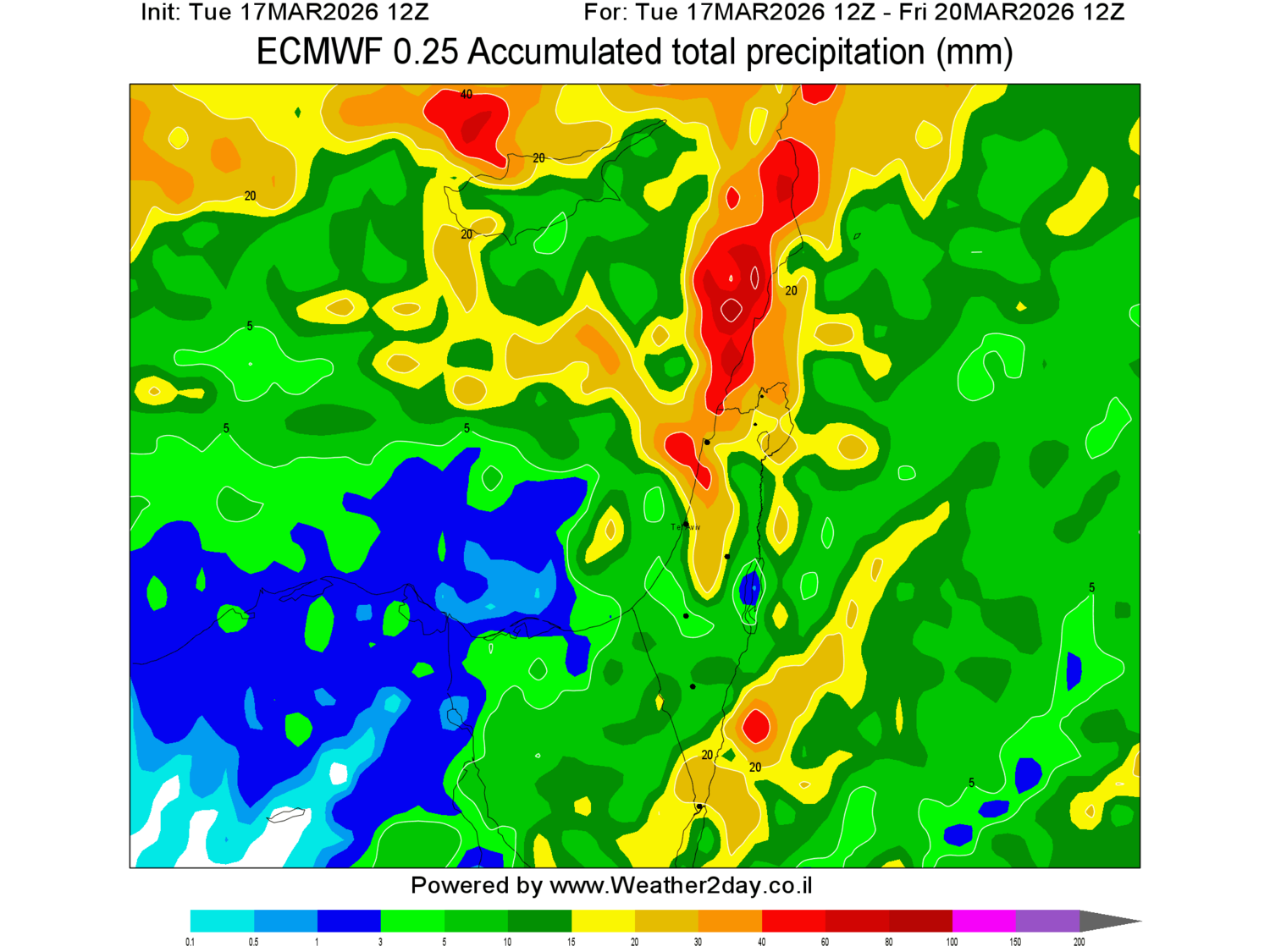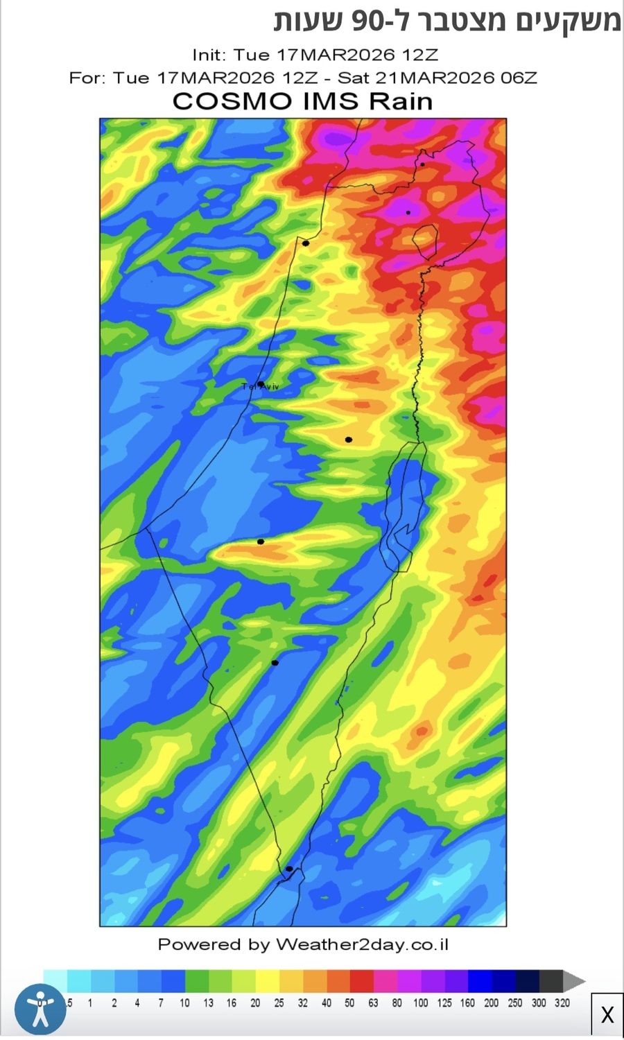 נותן להרצליה עד יום שני 20 מ"מ כשאי.סי. נותן 44 מ"מ (ועוד 55 מ"מ מעבר לטווח התחזית של שמ"ט)