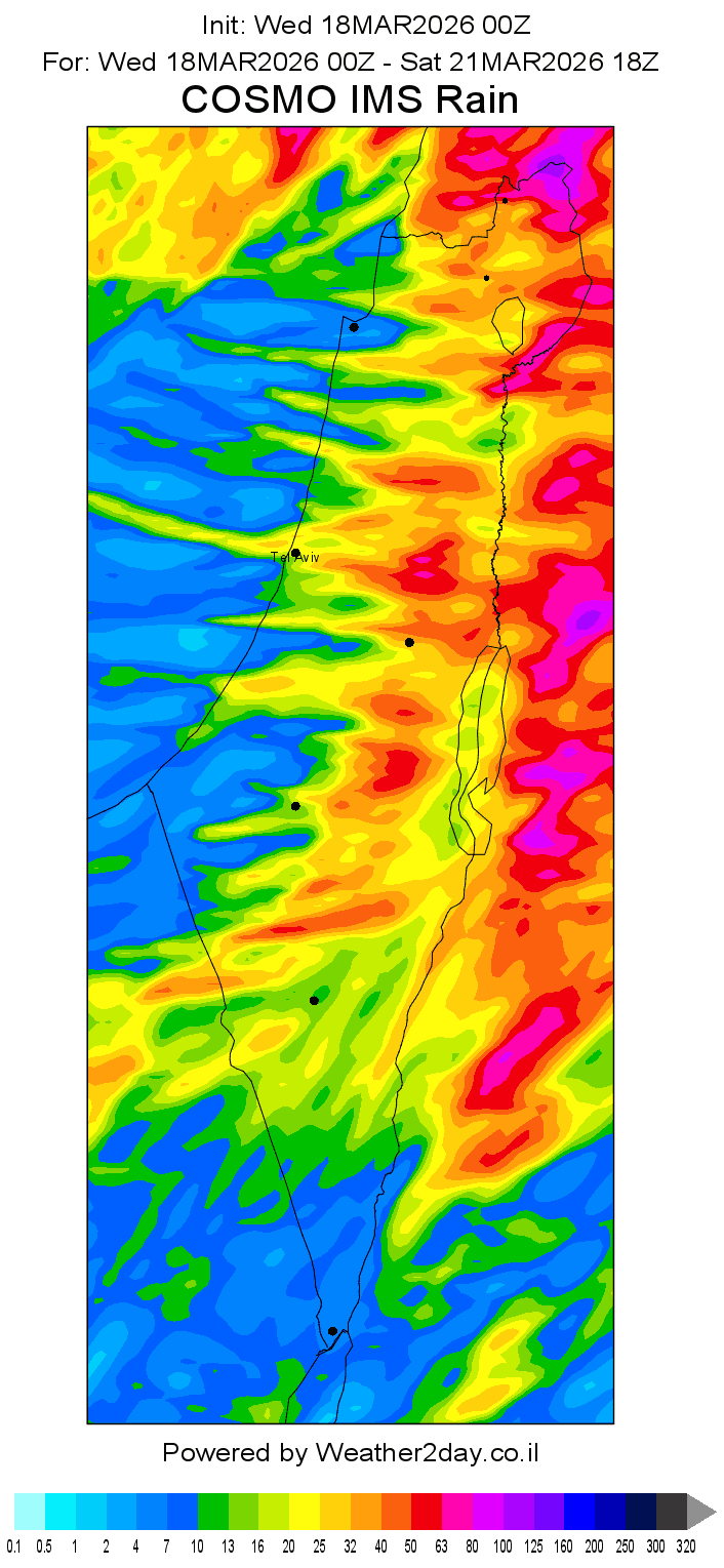 שים לב להרי גלעד, מואב ואדום בירדן שחזויים לקבל כמות כפולה ויותר מאשר הרי הצפון והמרכז אצלנו. (למעט צפון רמה"ג שחזויה לה כמות דומה)