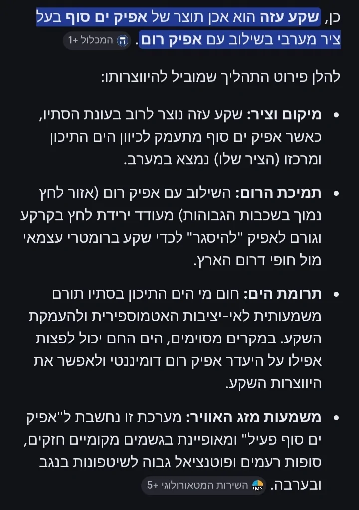 השקע שמתקרב אלינו הוא שקע אופייני לעונת האביב. הוא נע במסלול דרומי סמוך לחופי צפון אפריקה, ומתפתח כתוצאה מהבדלים גדולים בטמפרטורות בין האוויר החם שמעל יבשת אפריקה לבין האוויר הקר מעל הים התיכון. בשונה משקע שרבי טיפוסי, השקע הזה מלווה באפיק רום עמוק. במהלך יום רביעי, כשיגיע לאיזור הדלתא, הוא צפוי לנוע צפונה ואז הוא יקבל אופי של שקע קפריסאי. לכן, ברביעי הגשמים צפויים להתחיל בדרום, אך במהלך היום הם יתפשטו למרכז ולצפון.