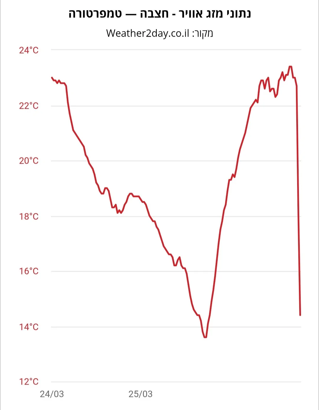 - צניחה חדה של 9 מעלות בחצבה תוך 50 דקות בלבד. מ-23.4° בשעה 14:10 ל-14.4° ב-15:00. מתנאל