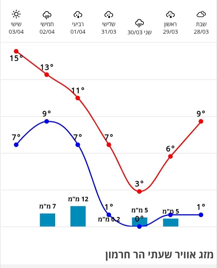 יום שני ( 30.03.26 ) : מעונן חלקית עם גשם קל שירד מדי פעם בצפון ובמרכז, במשך היום הגשם יתמעט ויפסק במרכז ובצפון הוא יוסיף לרדת תוך כדי שהוא ייחלש ויעשה יותר מקומי עד שיפסק בלילה. הטמפ' יעלו עלייה קלה מאוד, הטמפ' עדיין יהיו נמוכות מהרגיל לעונה. הרוח מערבית מתונה.