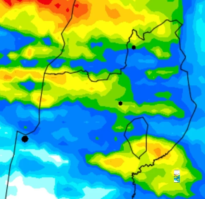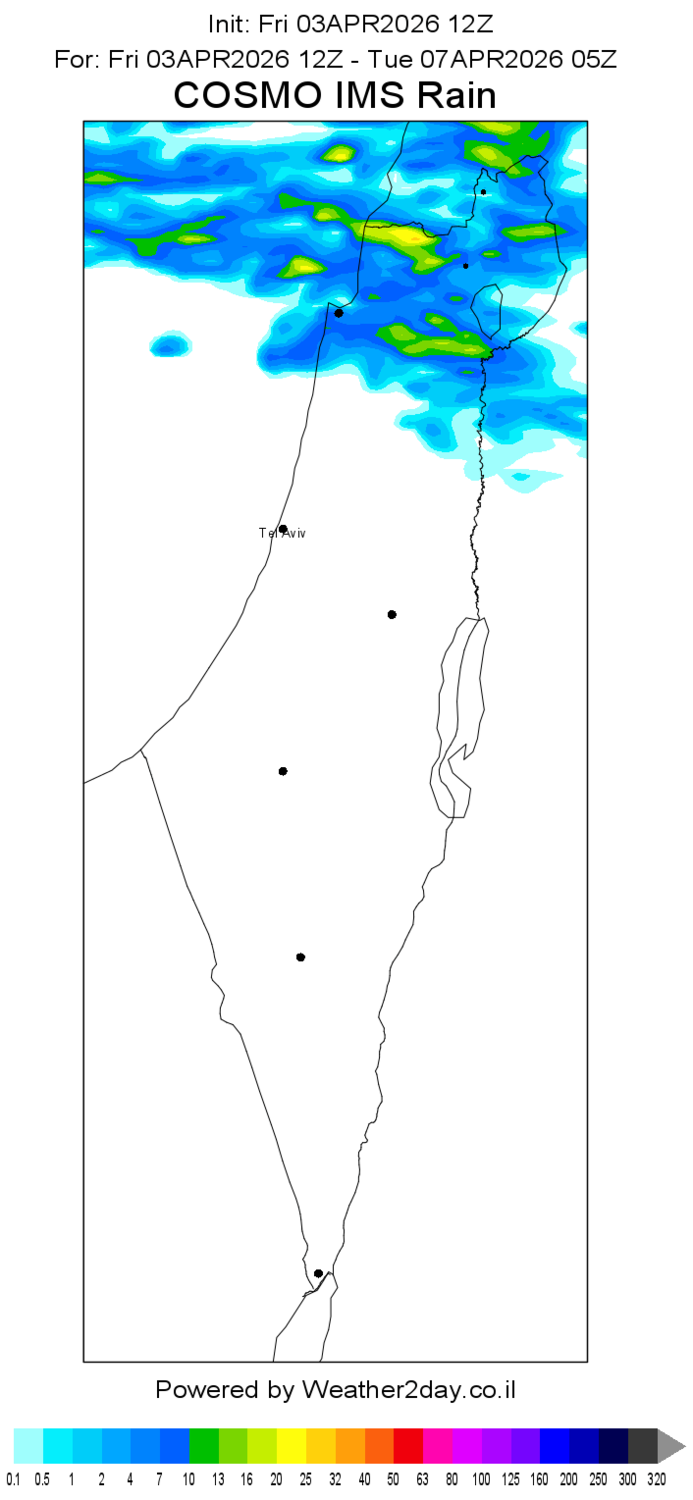 - קוסמו מעודכן - פרק גשם קצר מהלילה ועד מחר בצהריים ופרק גשם נוסף ביום שני בבוקר Weather2day