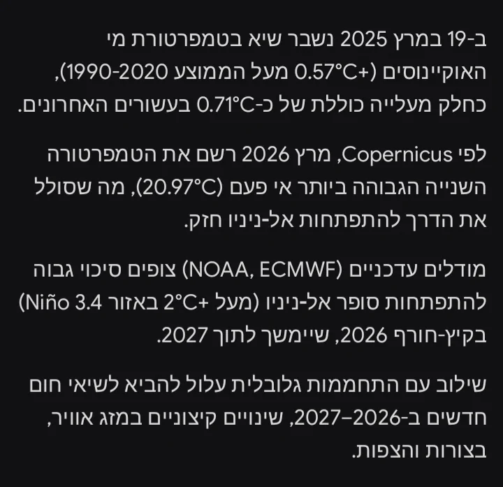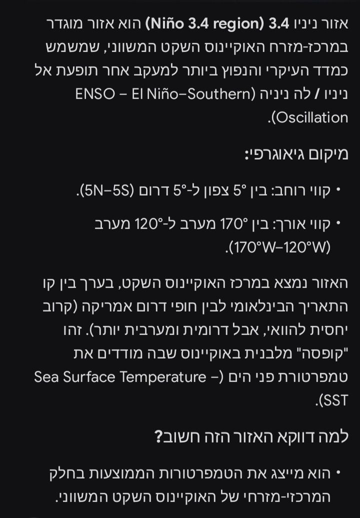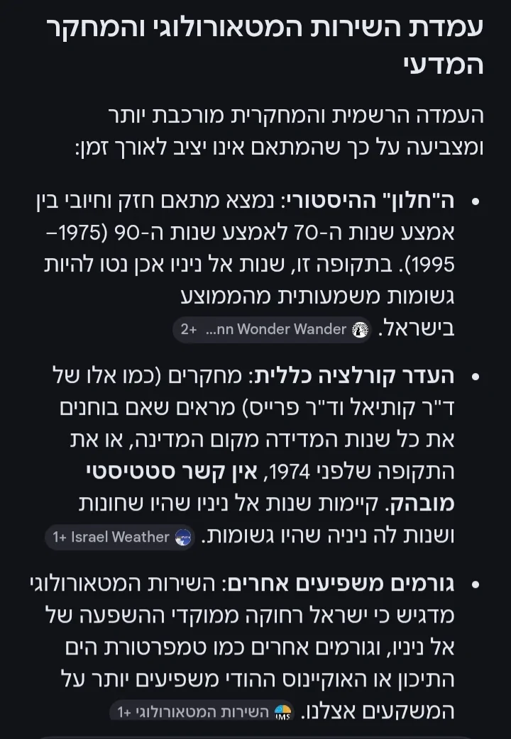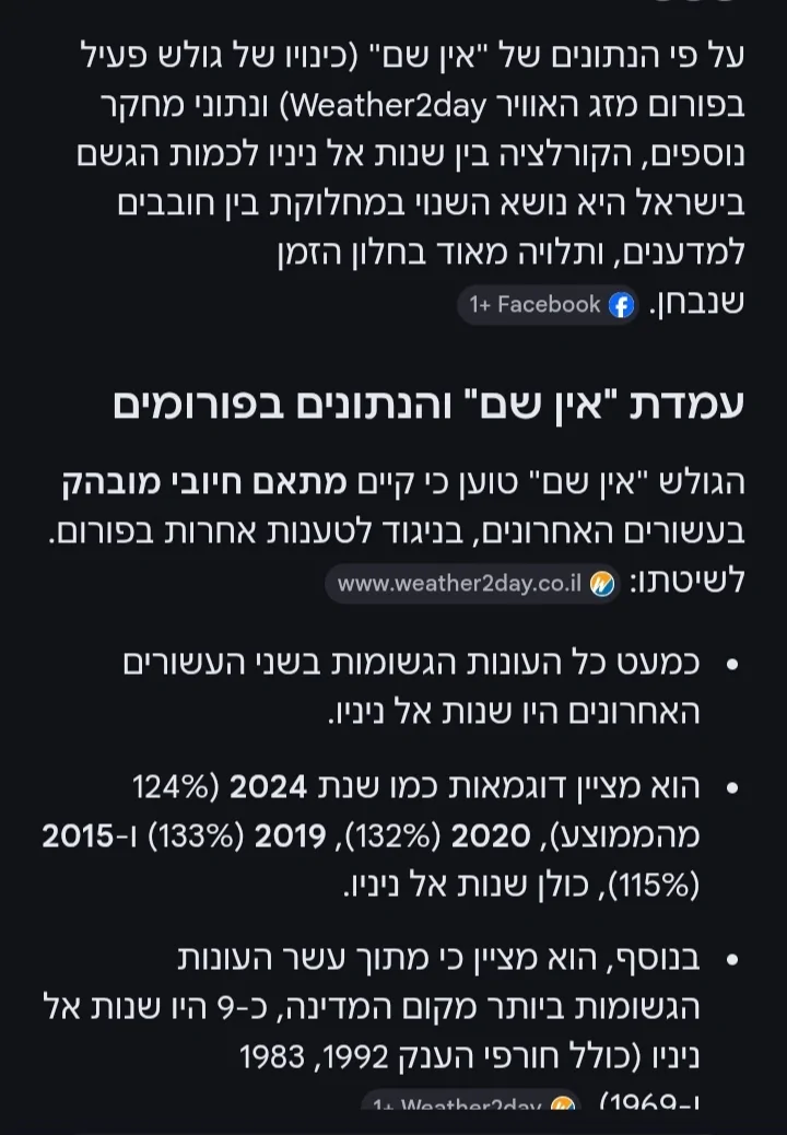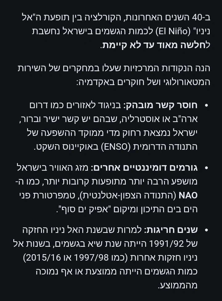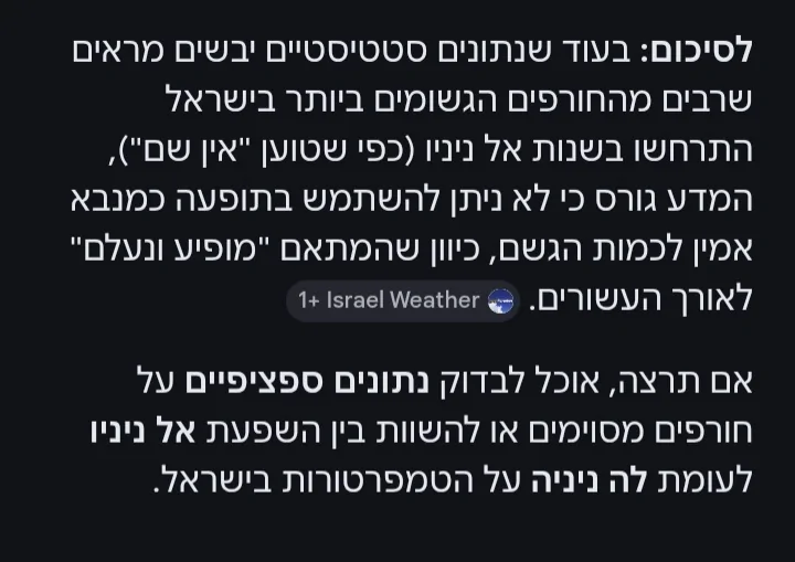 כדי שהAI ייתן תשובה מדויקת בנושא הוא צריך לפתוח מהאתר של השמ"ט את הסיכומים העונתיים מהעשורים האחרונים, ובו זמנית להשוות עם הנתונים של עונות הלה ניניה והאל ניניו, שבכלל לא קיימים בעברית, רק באנגלית. בהקשר של הממוצע הארצי אני בעיקר מסתמך בגרף עם עמודות צהובות שהשמ"ט מפרסם כל עונה בסיכום העונתי בקיץ, ויש מפה מקבילה באטלס האקלימי. הסתמכות מאוד ספציפית, אך היא תואמת לריאנליזה וידע היסטורי מאותן עונות. עם כמה שהאתר של השמ"ט מסורבל ומגושם, אני מתקשה להאמין שהAI עשה סקירה מעמיקה. אני עשיתי אותה פעם-פעמיים, אבל לא צריך יותר.