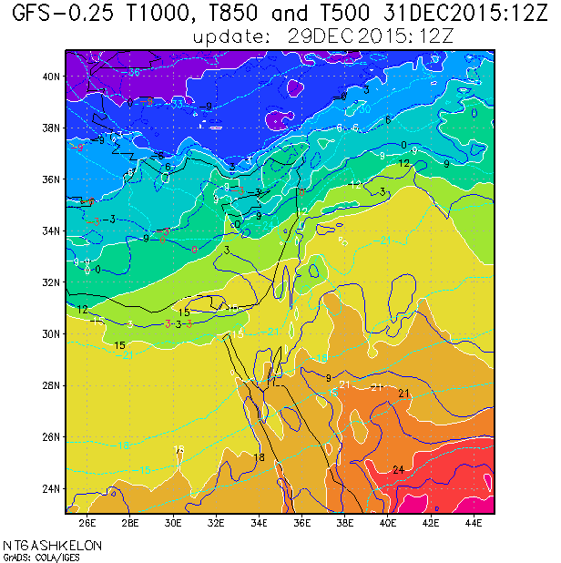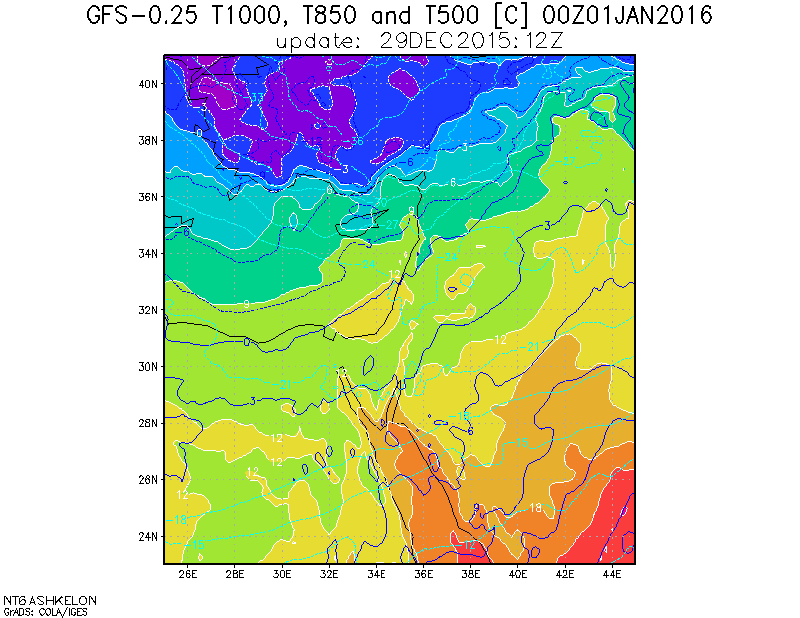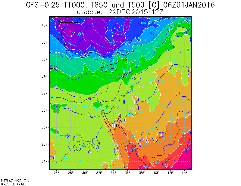 - עדכון ערב בשרתי GFS 0.25 : טמפ' במפלסים 1000, 850 ו-500 דני - אשקלון